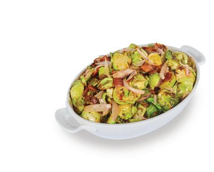 Roasted Brussels sprouts with savory smoky bacon and roasted shallots.