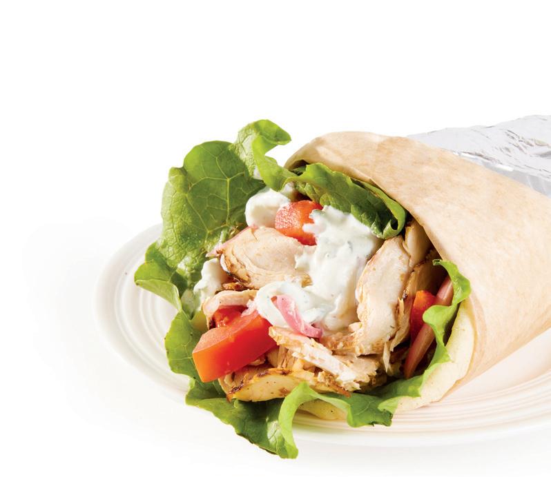 Greek marinated chicken thighs are loaded up with crunchy lettuce, cool tzatziki sauce, tomato and pickled red onion then wrapped in a soft pita.