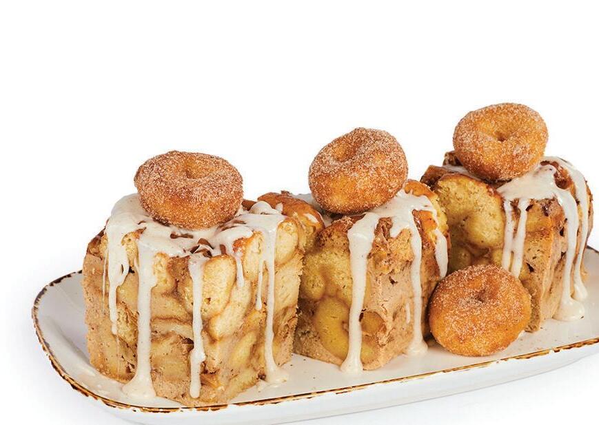 Apple cinnamon donuts soaked in a rich custard, then baked and drizzled with an apple cider glaze.