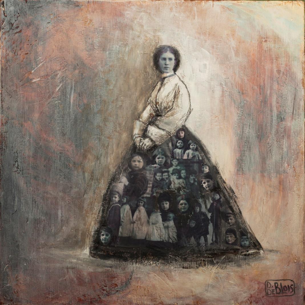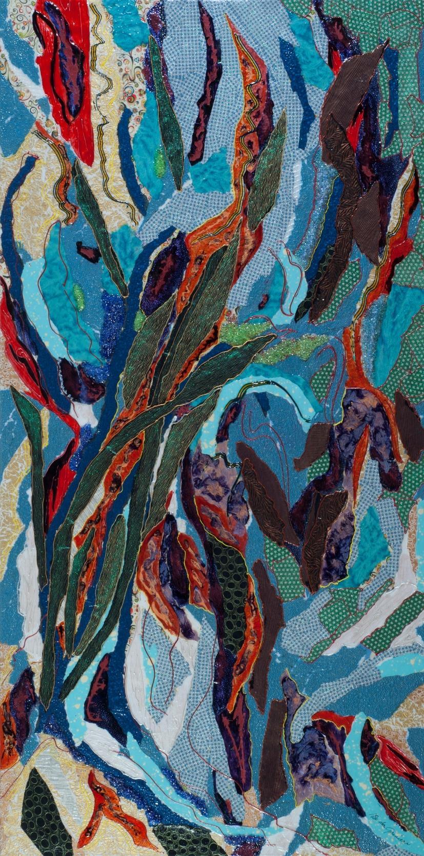Mes sources d’inspiration sont l’imaginaire, l’inattendue et l’assemblage de pièces qui se matérialisent de façon spontanée ainsi que l’alliance de l’acrylique à différents médiums : tissus, métaux, fermeture éclair, gel, pâte et tout ce qui trouve grâce à mes yeux.