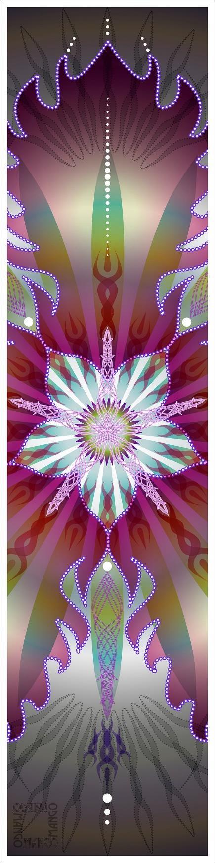Cette toile n’est pas le résultat d’une observation de la forme d’une fleur ou d’un élément naturel. C’est plutôt une réflexion personnelle : les figures en rouge ou orange s’unissent avec celles en bleu et vert pour générer une dynamique visuelle. Le noir révèle les formes aux couleur pâles. Le fond pâle de la toile apporte une couleur de soleil, de chaleur, de vie et d’énergie. La disposition serrée des figures symbolise la matière évoquée par René Descartes.