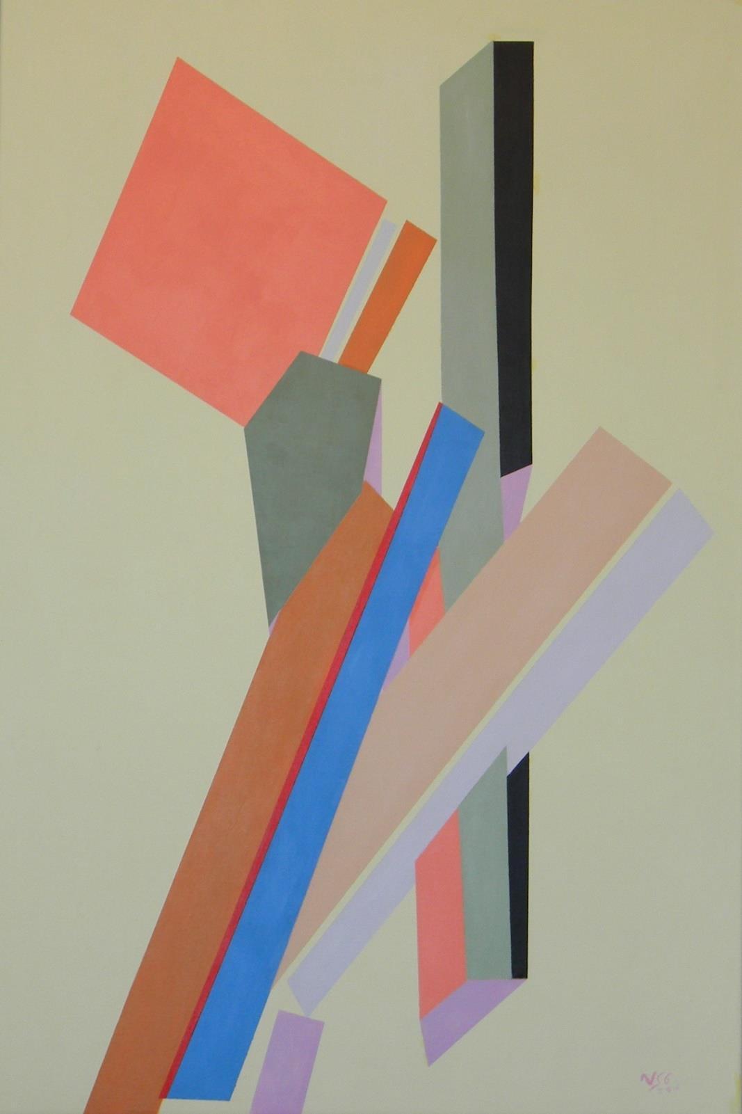 René Descartes constatait que la matière est une substance se développant en longueur, en largeur et en profondeur pour former la nature. Celle-ci est géométrique avec une force créative d’où jaillit la composition des éléments. Je me suis inspiré de cette définition pour la mise en forme de ce tableau abstrait. En utilisant les figures géométriques tels les rectangles, les triangles et le losange, je représente symboliquement la matière pour établir un parallèle entre de dessin géométrique et la nature.