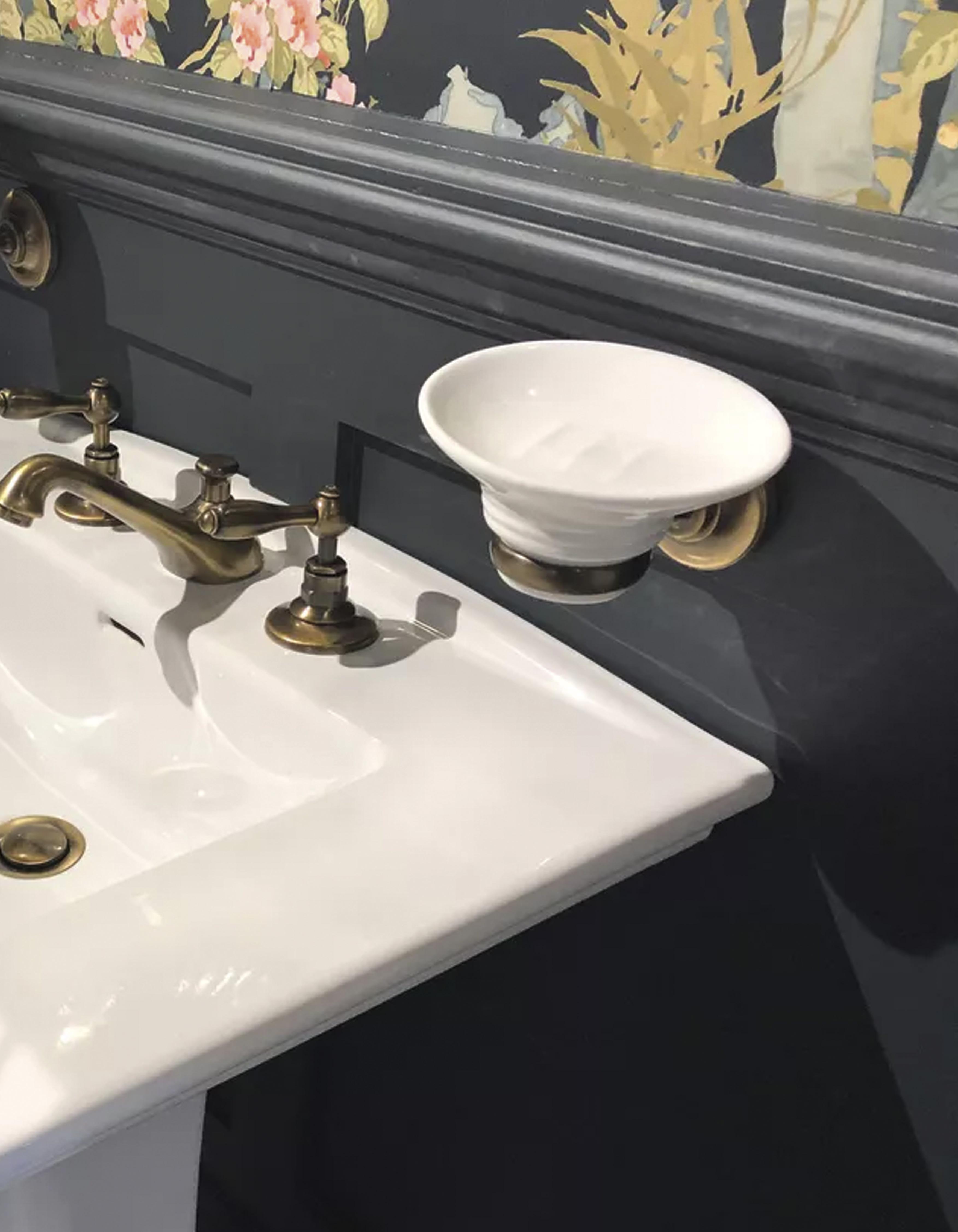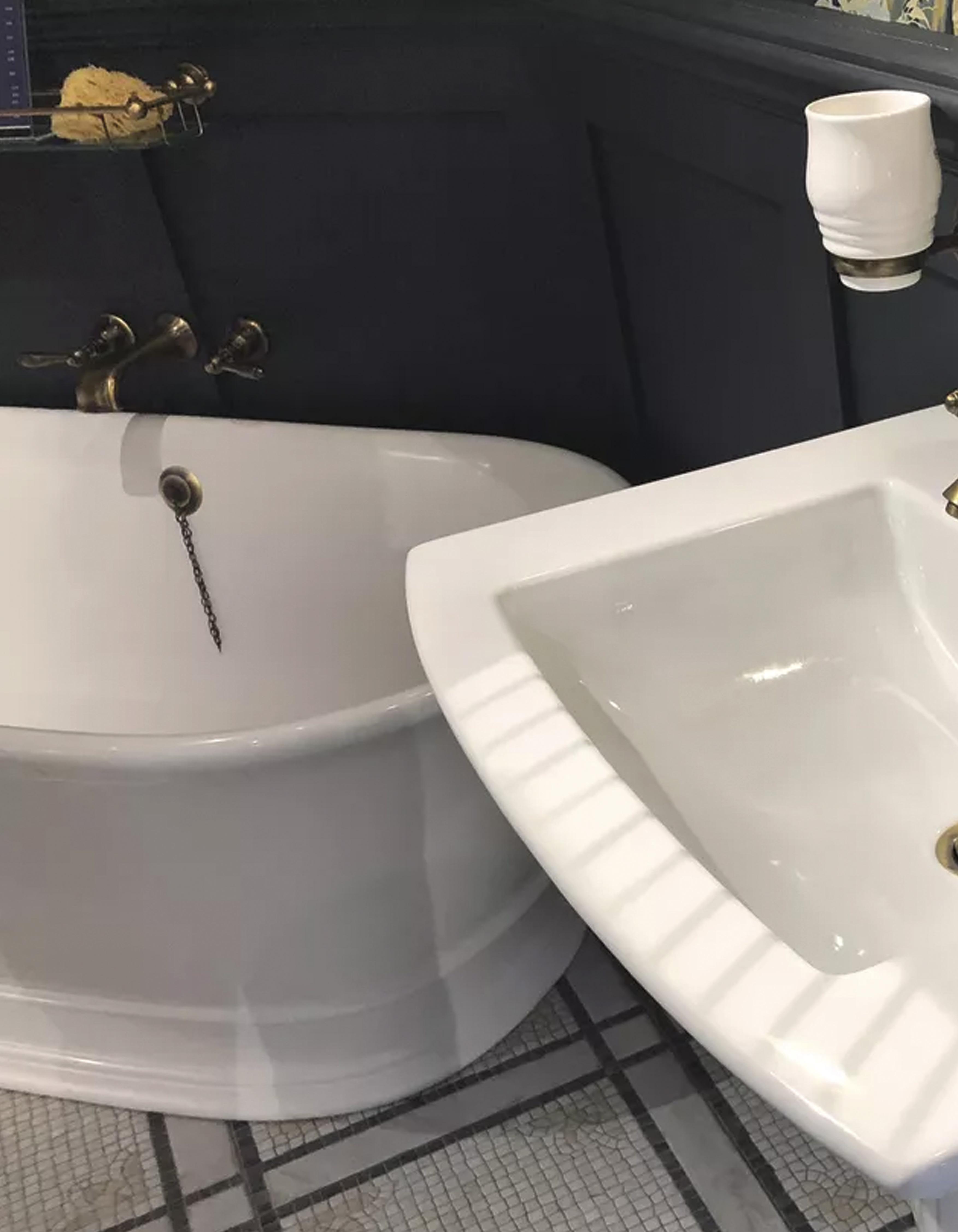 features a classic enameled cast iron Farmstead sink with integrated accessories and a Tournant semi-professional faucet while in her bath (right), a console table sink and brushed bronze finishes exude vintage charm. kohler.com