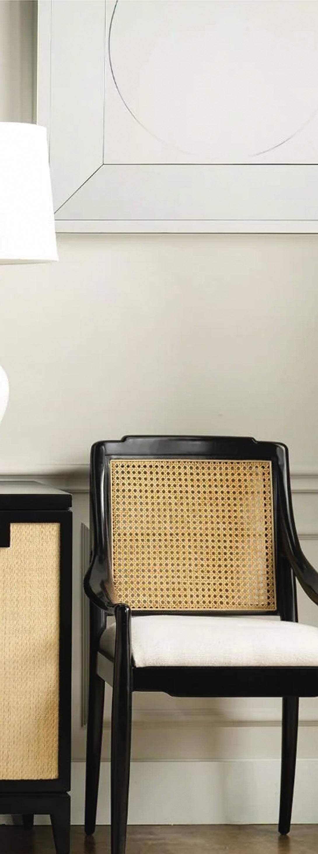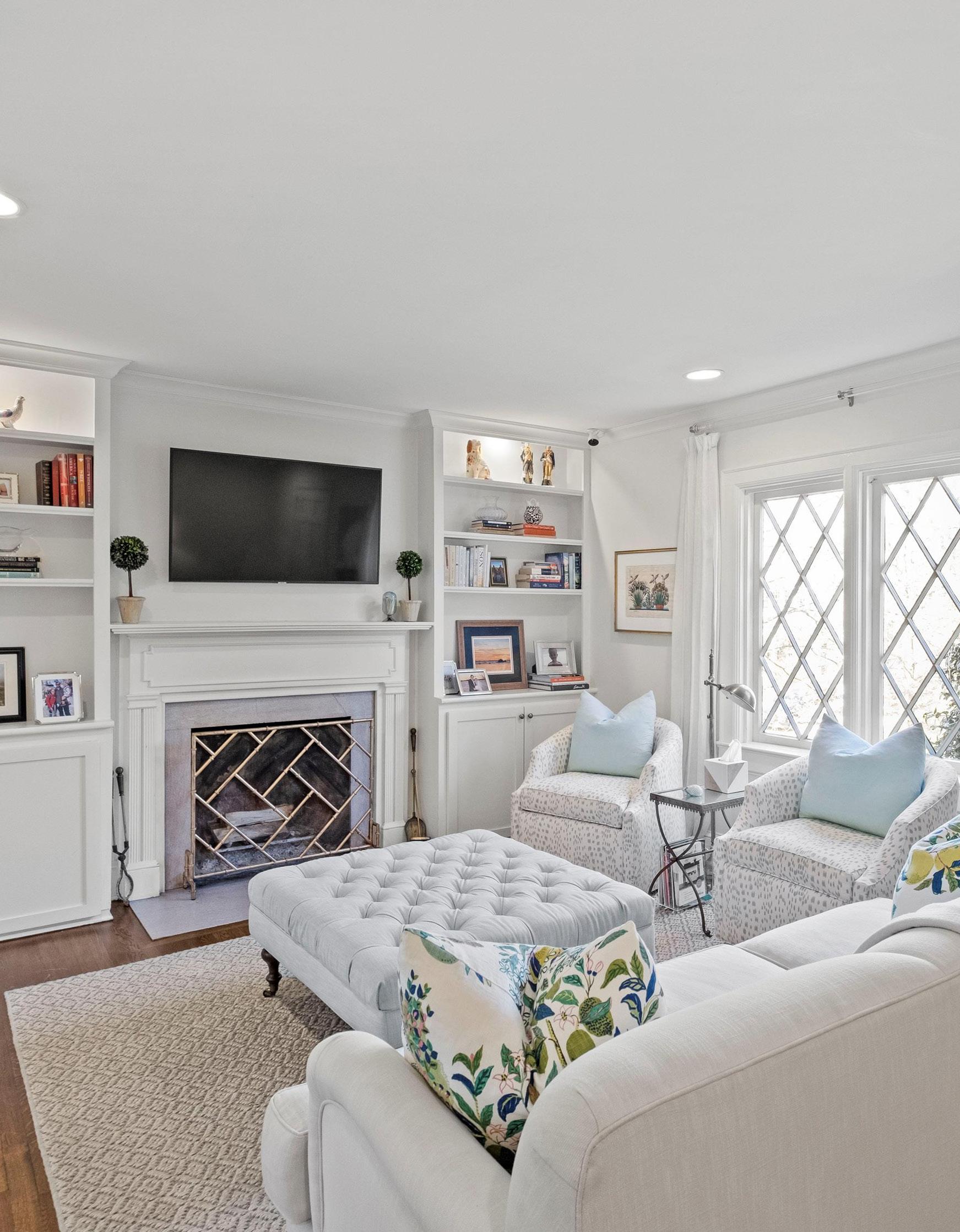 To enhance functionality and to create balance in the room, I introduced two custom leather, diamond-tufted backed swivel chairs, strategically positioned to catch the eye upon entering the space. Flanking the TV console, two accent chairs with caned backs added symmetry and visual appeal. Floating shelves were artfully installed above the accent chairs, creating a distinct backdrop for displaying the homeowners’ cherished memorabilia. Additionally, to bring all the seating elements together and define the central gathering area, a large wool area rug in various tones was carefully placed, grounding the space while infusing it with warmth.