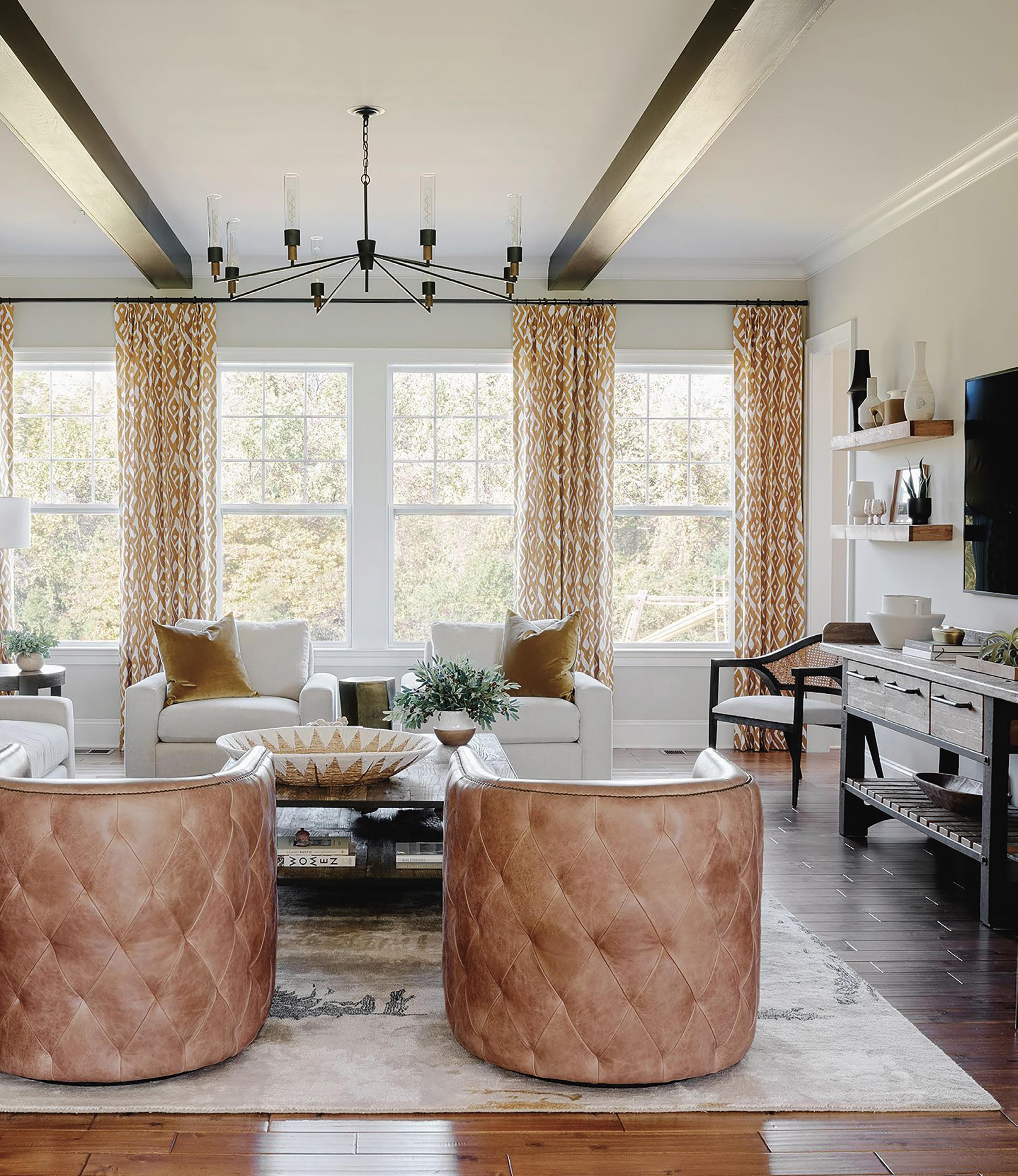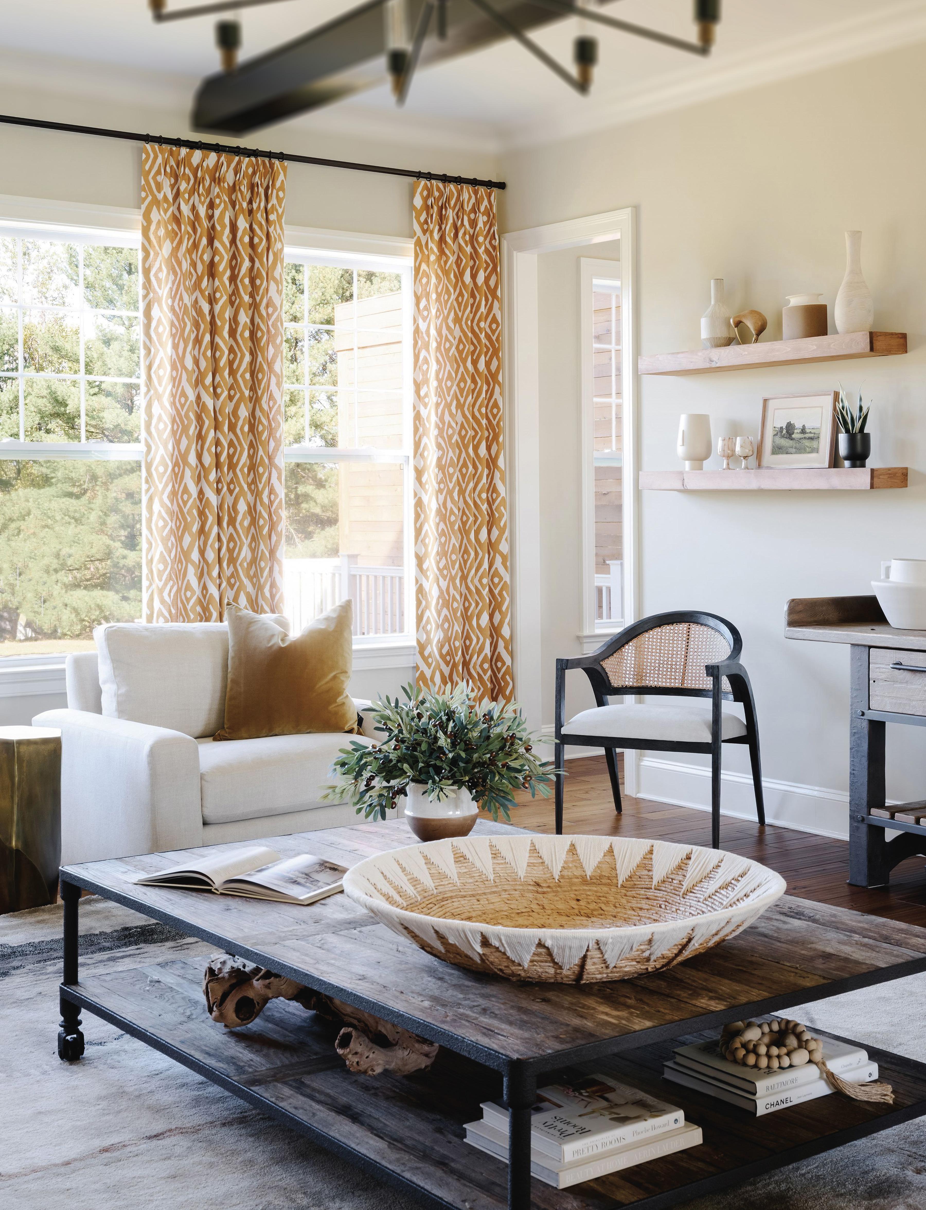 Creating a harmonious interplay of light and color, I adorned the windows with four panels of gold ikat print window treatments, suspended from a single black steel rod. I like to tell my clients to think of drapery as the jewelry of their homes. It adds such a gorgeous, custom-finished touch to any space.