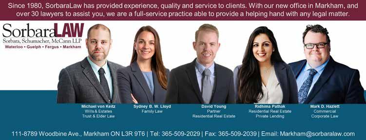 Markham VOICE Summer|Fall 2023 4 345 Renfrew Drive, Suite 202, Markaham, ON L3R 9S9 Jack Eigenmacht, B. Comm., CPA, CA, LPA, CFP T: 905.305.9722 ext. 228 E: jack@eigenmachtcrackower.com www.eigenmachtcrackower.com Business advisors with over 20 years of experience servicing various industries and providing personal services in: Accounting & Auditing Business Start-Ups Estate & Financial Planning Taxation – Personal & Corporate MEMBER Sparrownet@Trading Inc. DAVID T. LAM (416)989-9388 Sparrownet: Worldwide and regional trading in home goods, electronics, and the arts that raises quality of life by celebrating the material and spiritual value of culture and style. admin@sparrownet2trade.com www.sparrownet2trade.com