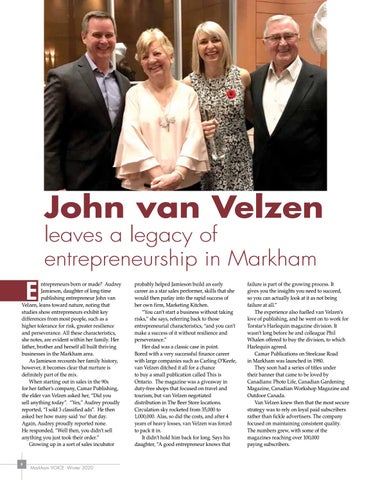 ntrepreneurs born or made? Audrey Jamieson, daughter of long-time publishing entrepreneur John van Velzen, leans toward nature, noting that studies show entrepreneurs exhibit key differences from most people, such as a higher tolerance for risk, greater resilience and perseverance. All these characteristics, she notes, are evident within her family. Her father, brother and herself all built thriving businesses in the Markham area. As Jamieson recounts her family history, however, it becomes clear that nurture is definitely part of the mix. When starting out in sales in the 90s for her father’s company, Camar Publishing, the elder van Velzen asked her, “Did you sell anything today”. “Yes,” Audrey proudly reported, “I sold 3 classified ads”. He then asked her how many said ‘no’ that day. Again, Audrey proudly reported none. He responded, “Well then, you didn’t sell anything you just took their order.” Growing up in a sort of sales incubator