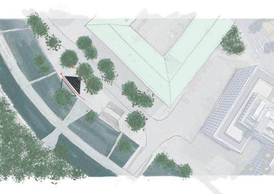 Die Oper war bereits zu Lebzeiten von Pina Bausch neben dem Schauspielhaus der feste Spielort des Pina Bausch Tanztheaters. Auch in Zukunft wird die Oper der Aufführungsort des Ensembles sein. Diese Intervention soll der Besucher hier über die Geschichte der Oper in Zusammenhang mit Pina Bausch informieren sowie sensibilisieren. Die Positionierung der Intervention ist unkonventionell, da sie sich auf dem Grünstreifen zwischen den Fahrbahnen befindet. Dies soll wiederum auf die Arbeitsweise von Pina Bausch hindeuten, da sie auch sehr gerne experimentierte und unkonventionelle Herangehensweisen hatte. Durch die Beschaffenheit der Intervention ist man zwar geschützt vom Außenraum, jedoch trotzdem mit ihm verbunden. Zudem hat man weiterhin den Blickbezug zur Oper.