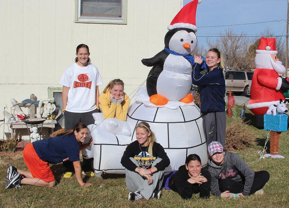 In 2012, the softball team helped put up decorations. Here the team pose by an igloo and penguin in the yard.