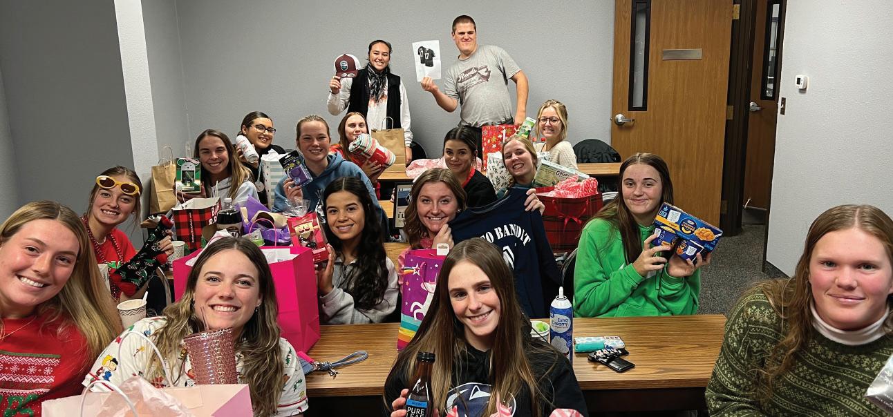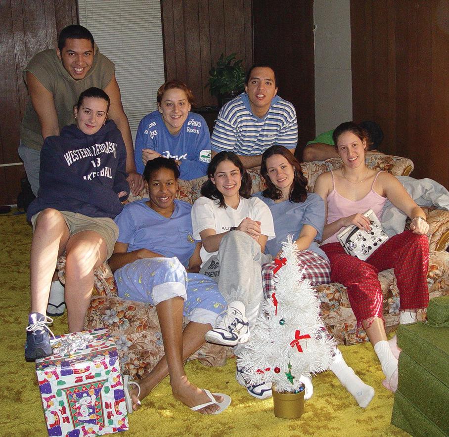 In 2002, several Brazilians couldn’t go home for Christmas and they stayed in a house that they rented for a month in Gering. Here, the Brazilians have a small tree and some presents. Pictured in the back row leaning on the sofa is former player and coach and now head coach at California Bakersfield Giovana Melo.