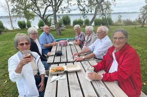 Var bl.a. på øens højeste punkt på 22 meter, kaldet Milebjerg. Vi spiste den medbragte frokost eller specielle Bjørnø burger, i øens dejlige have.