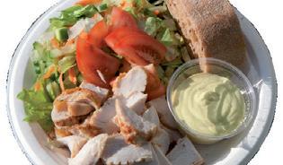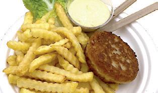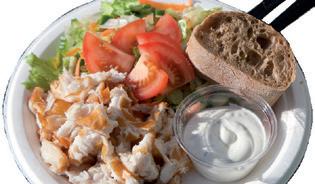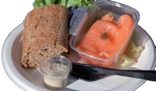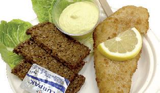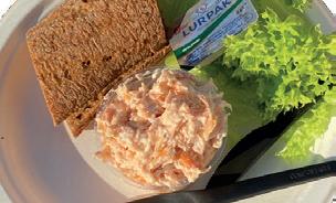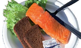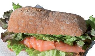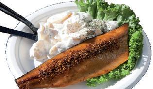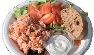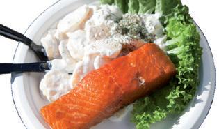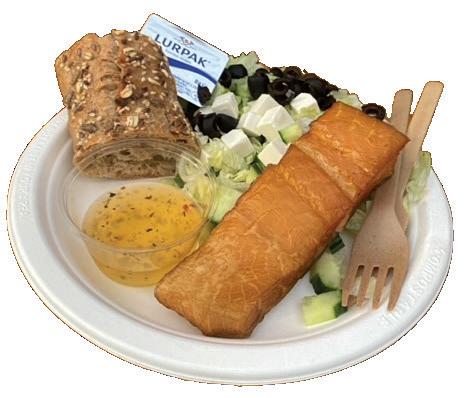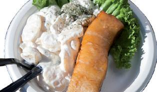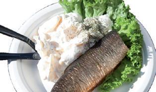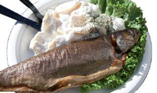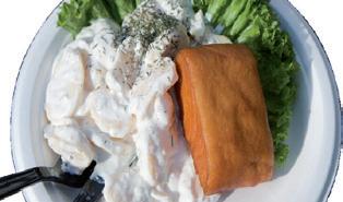 Varmrøget laks eller hellefisk Serveres med salat og dressing samt brød og smør. Vælg mellem kartoffelsalat eller friturefrie pommes frites med salatmayo.