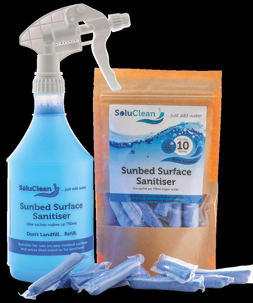 SoluClean Sunbed Cleaner is a pre-measured water soluble sanitiser for use in a trigger spray bottle. Simply drop the sachet of powder into any trigger spray bottle for the perfect pre-mixed sanitiser. Ideal for the sanitising/cleaning of acrylics and all other surfaces. Clean Mint fragrance. Each box contains 10 soluble powder sachets making 7500ml (7.5 litres) of solution.