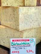 Frühlingsaroma! Bärlauch bringt den Frühling auf den Tisch. Er verleiht mit seinem feinen Duft und dem delikaten Geschmack dem Bärlauchkäse, einem halbfesten Schnittkäse, eine aromatische Frühlingsnote. Die Bärlauchcreme, die wie der Käse aus frischer Heumilch hergestellt wird, eignet sich als Brotaufstrich oder auch als pikanter Dipp. Natur pur! Man schmeckt die gute Bergluft, das reine Quellwasser und die saftigen Almwiesen in den Käse-, Schinkenund Brotspezialitäten.