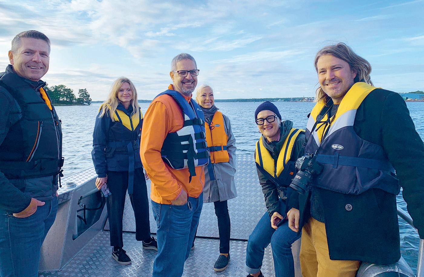 Hur upplevs ackumulatortanken från vattnet? Inför första workshopen för gestaltningsidéer samlades Clas Johansson, produktionschef, Klara Wallby, landskapsarkitet, Joachim Axelsson, processingenjör, Sara Dolk, stadsarkitekt, Malin Nilsson, planeringsarkitekt, Simon Klamborn, arkitekt på en båttur i syfte att skapa en bild över hur ackumulatortanken kommer upplevas via farleden in mot Västervik.