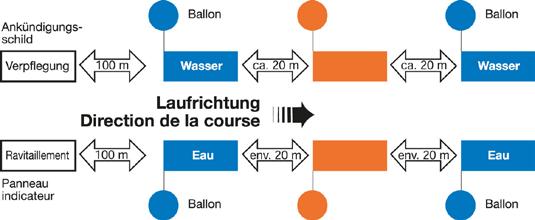 10-km-Strecke: Bei km 1.7, 3.8 und 8.6: Gatorade und Wasser; bei km 6: Wasser
