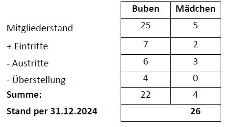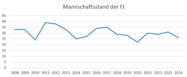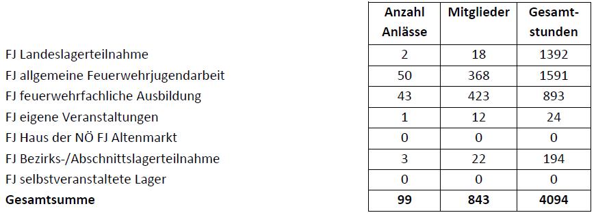Der Mitgliederstand ging im Berichtsjahr auf sieben Mitglieder zurück. Die Feuerwehrjugend kam insgesamt zu 44 Anlässen (Gruppenstunden, Bezirks– Landesbewerb sowie bei eigenen Veranstaltungen) zusammen und hat dafür 2.033 Stunden aufgewandt.