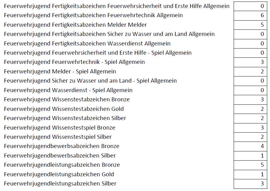 Im Jahr 2024 wurden insgesamt 19 Abzeichen erworben - sei es im Wissenstestspiel– bzw. Wissenstest, dem Feuerwehrjugendbewerbsabzeichen oder dem Leistungsbewerb oder beim Fertigkeitsabzeichen Melderspiel –bzw. Melder.