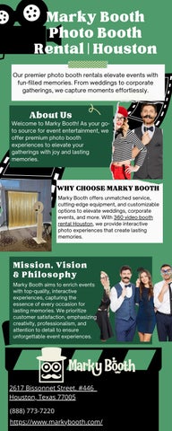 Elevate your event with Marky Booth’s exclusive photo booth rentals! From weddings and birthdays to corporate events and other special occasions, our stylish booths and advanced technology ensure every moment is captured with flair, making your event truly memorable. CONTACT DETAILS: Marky Booth Photo Booth Rental | Houston 2617 Bissonnet Street. #446 Houston, TX 77005, United States 888-773-7220 Open 24 hours Website & Social Links Website https://www.markybooth.com/houston-tx-photo-booth-rentals/ Google Business profile https://www.google.com/maps?cid=5767487420146362107 Facebook https://www.facebook.com/markyboothphotoboothrentalhouston/ X https://x.com/markyboothhtx Youtube https://www.youtube.com/@markyboothhouston Instagram https://www.instagram.com/markyboothhouston/ Pinterest https://www.pinterest.com/markyboothhouston/ Linktree https://linktr.ee/markyboothhouston Tiktok https://www.tiktok.com/@markyboothhouston Storeboard https://www.storeboard.com/markyboothphotoboothrentalhouston2 Ezlocal https://ezlocal.com/tx/houston/party-equipment-rental-service/0918262095 Cybo https://www.cybo.com/US-biz/marky-booth-photo-booth-rental-%7C_10 Cylex https://www.cylex.us.com/company/marky-booth-photo-booth-rental--houston-38904073.html Tumblr https://www.tumblr.com/blog/markyboothhouston Find us here https://www.find-us-here.com/businesses/Marky-Booth-Photo-Booth-Rental-Houston-Houston-Texas-USA/34143064/ Services: OPEN AIR GLAM BOOTH 360 VIDEO BOOTH AI BOOTH (GLAMBOT) ENCLOSED GREEN SCREEN Products: NEON SIGNS INVITATION DESIGNS SERVICES BACKDROPS LIVE DESSERT TATIONS PHOTO PROPS STANCHIONS / ROPE CROWD BARRIERS RED CARPETS GUEST BOOK & SCRAPBOOK