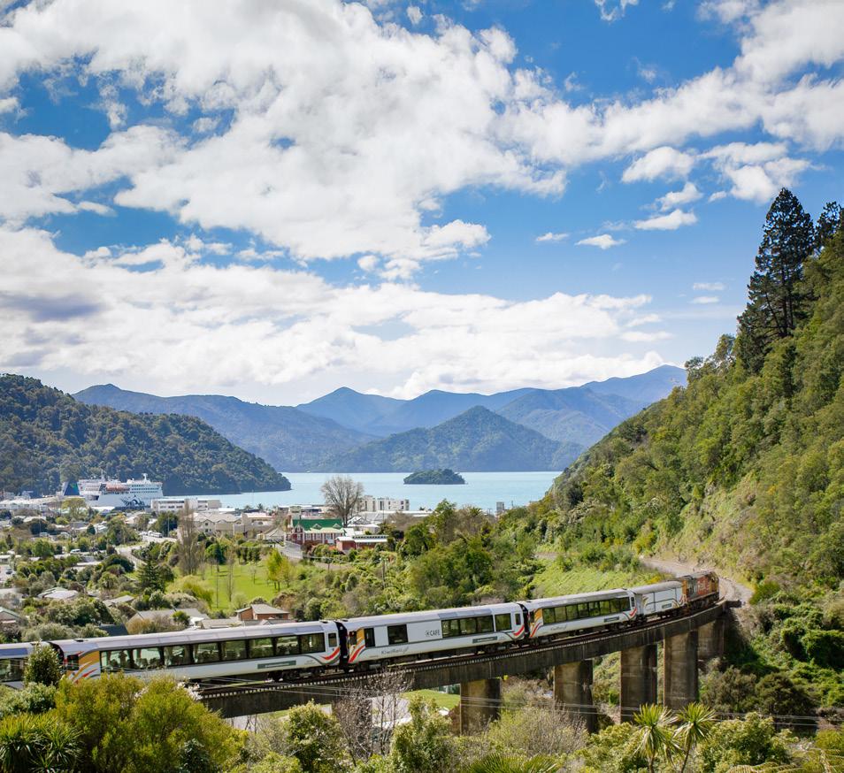 The Coastal Pacific train travels from Christchurch to Picton via Blenheim along the scenic Kaikōura coast. During summer, the historic Marlborough Flyer train schedules special trips.