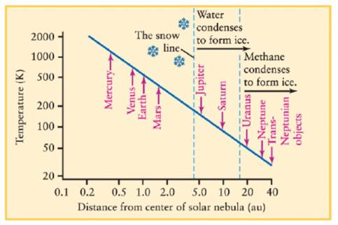 Figure 1: illustration oF how temperature drops with distance From the sun, causing the Frost line at about 4.5 au, where water and other hydrogen compounds can condense into ice (image credit: