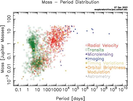 Since the discovery of the first exoplanet in 1992, over 5,500 exoplanets have been discovered in more than 4,000 exoplanetary systems (NASA, et al., 2023); Figure 3 shows the distribution of these exoplanets by period and mass, detailing their discovery method. There is a clear bias in each method for the kind of planet that it can detect. However, myriad planets exist in multiple configurations, and they are not all like those found in the Solar System. The discovery of massive gas planets orbiting close to their host star (Hot Jupiters) challenged the quiescent solar nebula theory, forcing new methods of evolution to be formulated (Dawson & Johnson, 2018; Heller, 2019; Zink & Howard, 2023). Systems at all stages of development are observed, some planets have highly eccentric planetary orbits, and there are a range of densities and sizes,