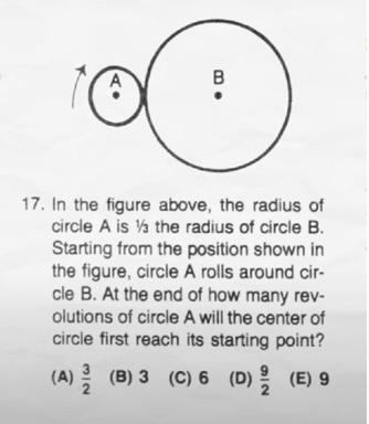 The intuitive and general answer was B as the circumference of a circle is just 2Πr and since the radius of circle B is 3 time of circle A, the circumference must also be 3 times the circumference of A. Logically, it should take 3 full rotation of circle A to roll around circle B. This is incorrect but so are answer A, C, D and E. The reason why nobody answered question 17 correctly was because the test writer themselves made a mistake, also thinking that the answer was 3. The actual correct answer was not listed in this option.