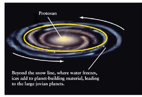 Today we see four inner rocky planets and four outer gas planets. How did this segregation occur? The effect of radiation from the Sun drops off with distance, meaning that the temperature decreases with increasing distance. Close to the Sun, within the Frost Line, also called the Snow Line, which is at about 4.5 AU from the Sun, the temperature is high enough that hydrogen compounds such as water, methane and ammonia could not condense into solids, whereas heavier metals such as iron were in solid form (see Figure 1). Planets within the Frost Line accreted the solid heavier elements to form their cores. Beyond the Frost Line, the temperature had dropped sufficiently that the lighter molecules could condense to form ices; these ices coalesced with the heavier metals to form the more massive cores of the outer planets. The radiation from the Sun also pushed the lighter molecules out towards the forming outer planets. The large mass of their cores accreted the lighter hydrogen and helium