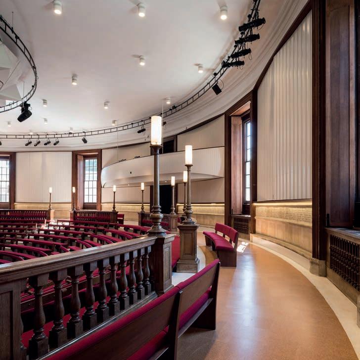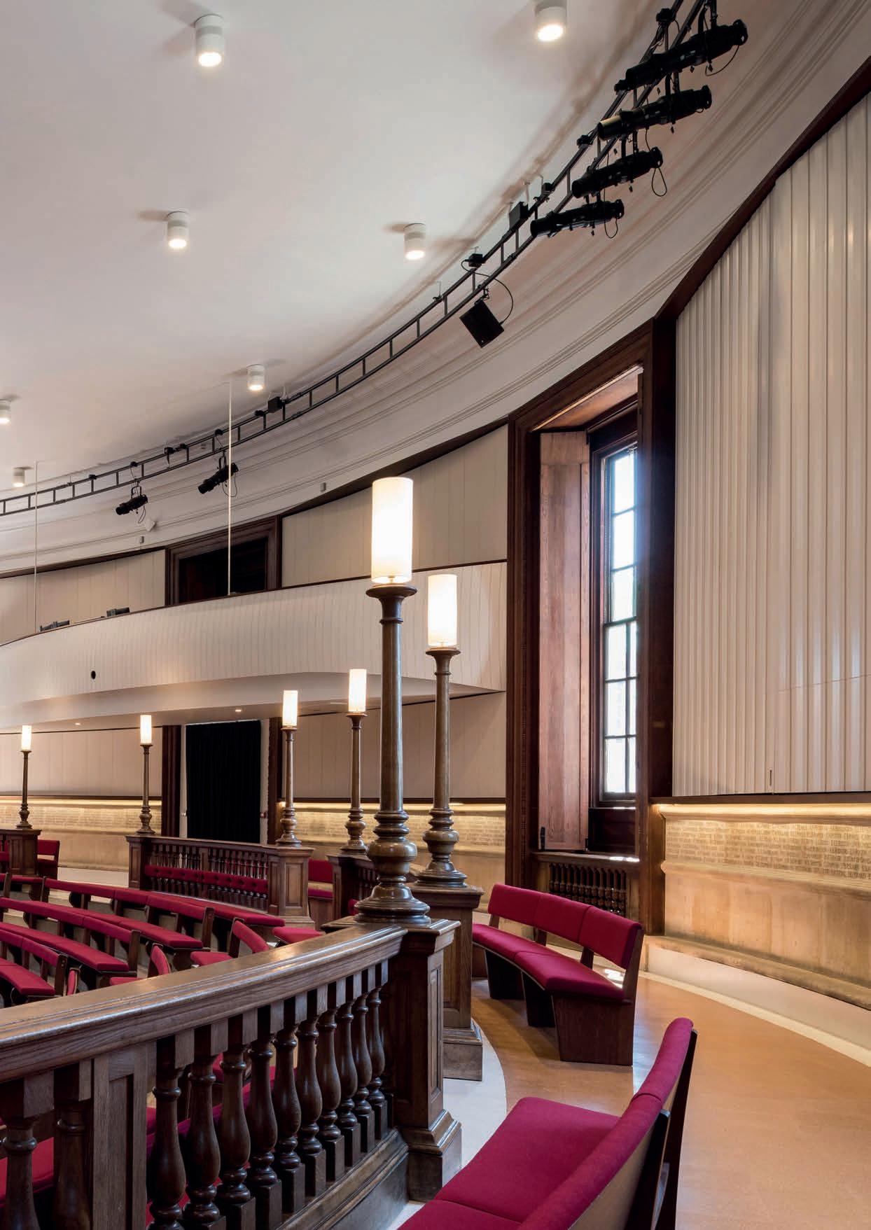 The raked seating in the Memorial Hall was bitterly uncomfortable. Some felt this was reason enough to rip out the old benches and start afresh. While there was merit to that idea, both in terms of comfort and acoustics, the steep raking of the amphitheatre seating meant there simply was not the space to instal modern theatre seats. In any event, we concluded that the benches were integral to the feel and the charm of the Hall, so we kept them, adding as much padding as we could and reupholstering them in fabric to