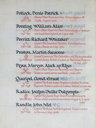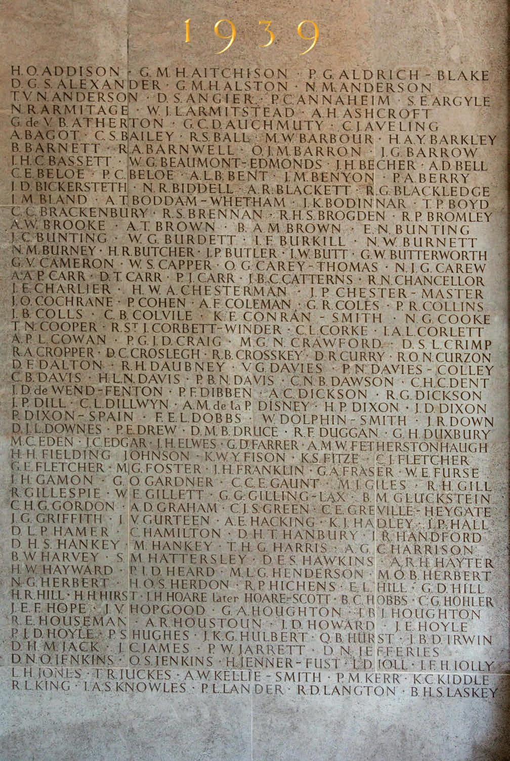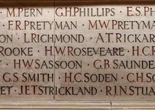 There were to follow 748 more former pupils and members of staff (teaching and non-teaching) who were to ‘make the ultimate sacrifice’, as the language of the time often put it. Their names, expertly carved along the back wall of the Memorial Hall, ‘cut in Ancaster stone by Mr Lawrence Turner (C1 1877-81), and faintly tinted grey and red’ (as described by Darcy Braddell in The Architectural Review of June 1925), are the simplest of memorials. Yet behind each name lies a person and a story, some as in the case of Leslie Richmond only thinly known, others more fully lauded and remembered.
