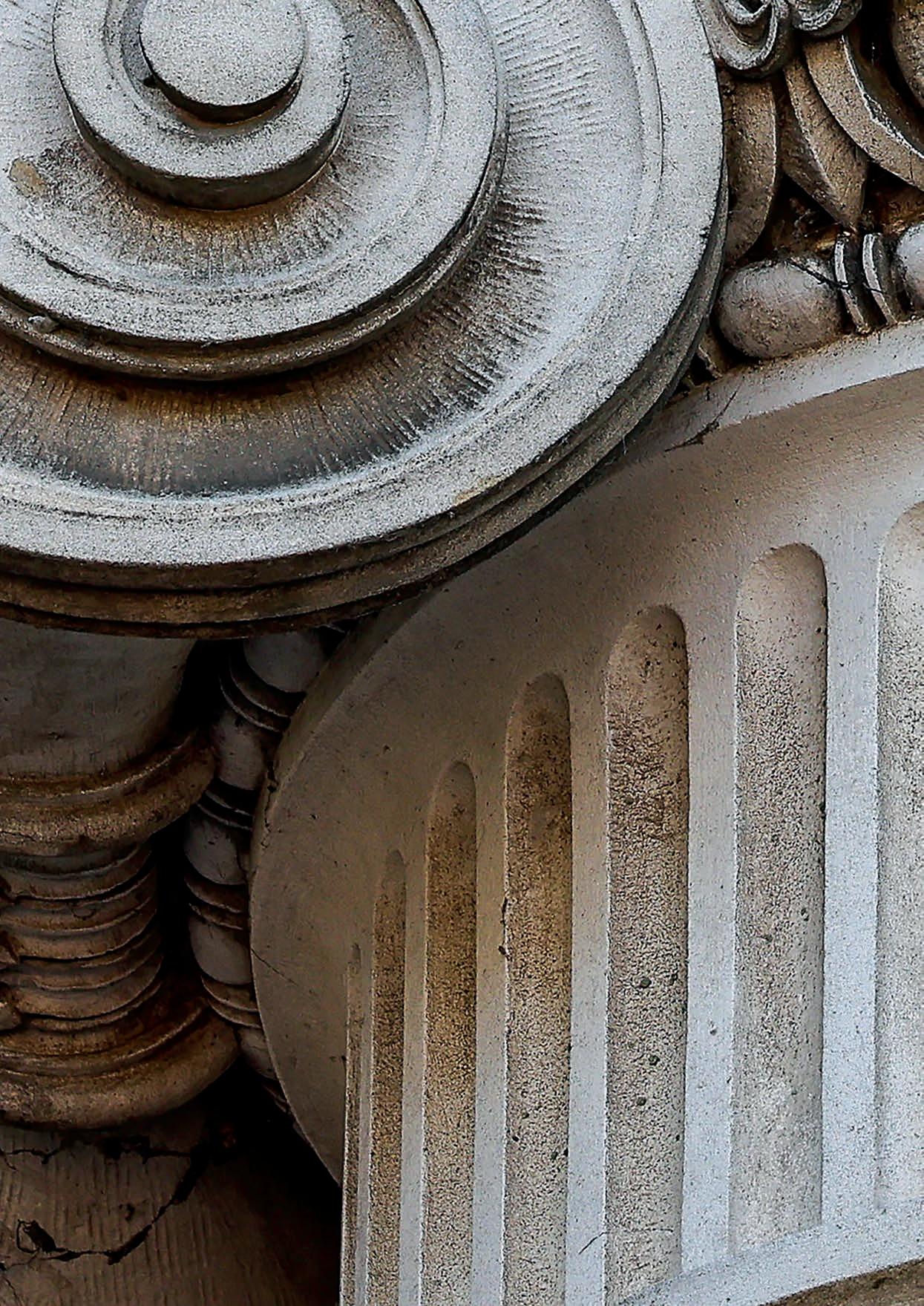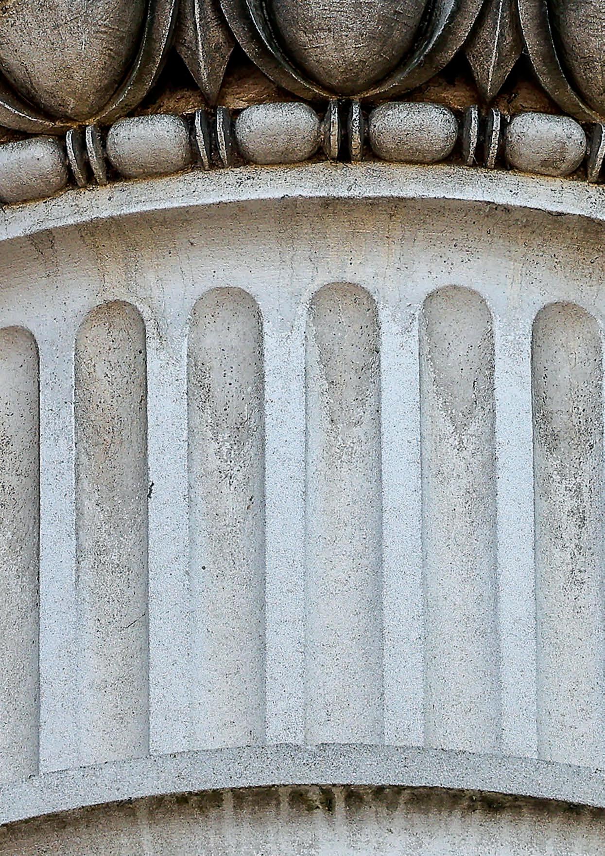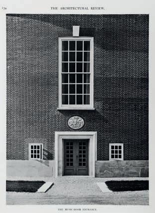 The Hall, as built, may be less spectacular than the first design, but it is an impressive building in a form of stripped Classicism, a style which became popular in the years between the wars. This architecture rejected overblown turn-of-the-century taste and reflected the desire for order and stability in the inter-war years. At its best it can be an imaginative, refined and pared-down reinvention of Classicism, but it was also appropriated by totalitarian regimes in the 1930s, with overpowering results. Newton’s interpretation of Classical grammar presents a striking spectacle to travellers passing by the College on the A4, but although it is imposing, the Hall also speaks of restraint. The north front is red brick with stone dressings, with closed end bays, which were deliberately left free of ornament or inscriptions. These frame a loggia of eight giant plain Portland stone columns (replacing the six of the original design) with fluted Ionic capitals surmounted by a parapet, with a cornice which reflects Newton’s understanding of the language of Classicism. The fine two-inch bricks used by Newton result in rich wall surfaces that accentuate the use of stone in the building. The semicircular southern wall of brick is punctuated by the seven tall windows of the auditorium, the square windows of the basement and a southern entrance, which was later given a second entrance reached by twin staircases. At their summit the stairs are adorned by an oval panel of stone carved musical instruments, which was once placed in the wall immediately above the south door.
