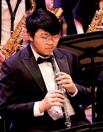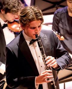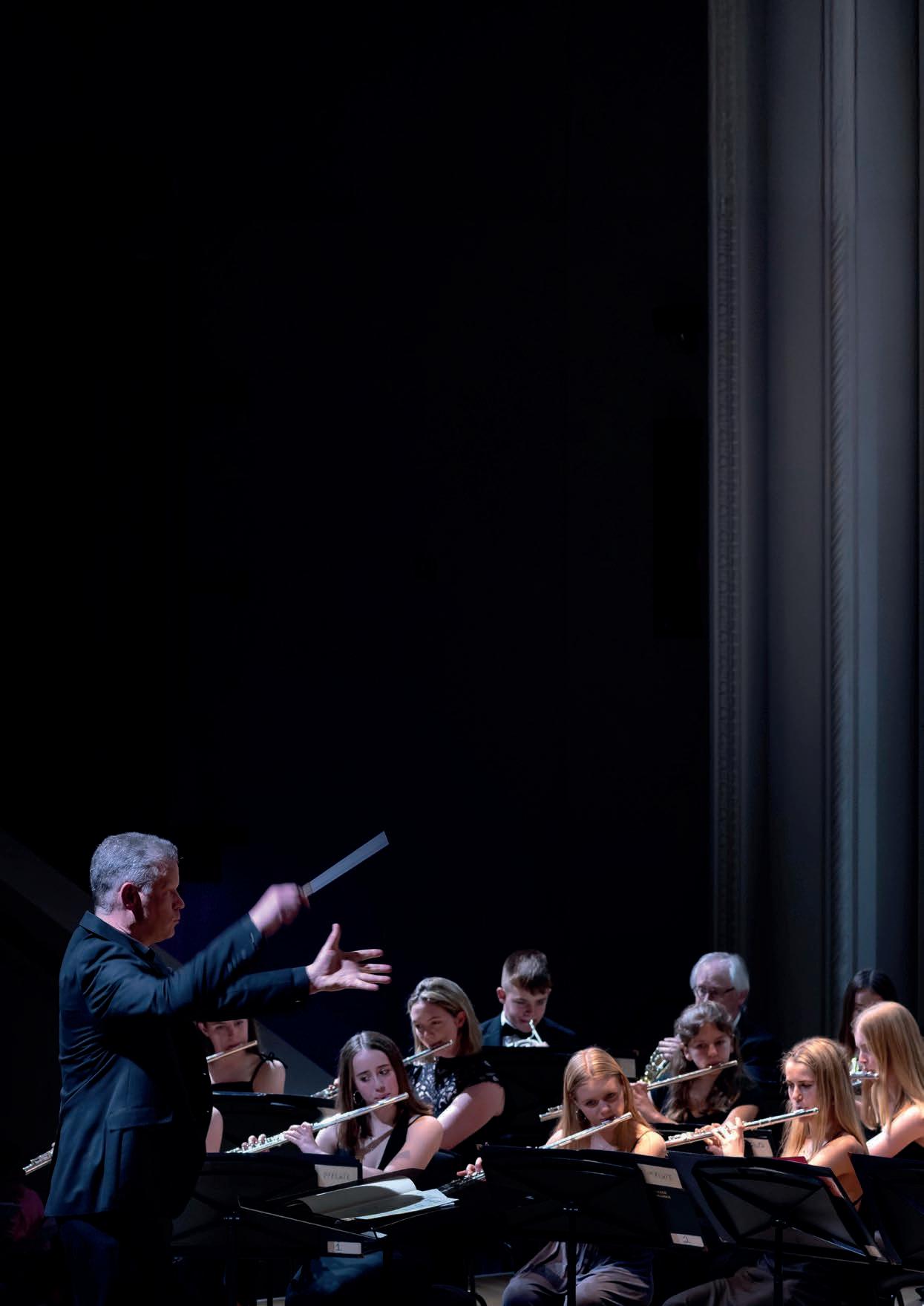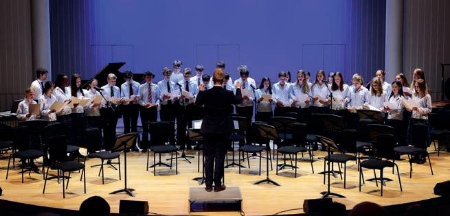 Brasser, conducted by Alex Arkwright with leader Freddie Vine, moved from a blaze of colour in John Cacavas’s Days of Glory to the haunting sounds of Mazama , inspired by legends from the Mazama tribe of the American North-West. Chamber Orchestra, under the baton of Sara Stagg, with leaders Idris Scrase and Theo Morgan, introduced the first of the soloists, Theo stepping forward as the violin soloist in ‘Spring’, from Vivaldi’s Four Seasons. The third movement of Gerald Finzi’s Clarinet Concerto, with soloist Freddie Vine (B1 U6), followed. Both soloists played beautifully and with fine technique, finding an excellent balance with the orchestra in the Hall’s sympathetic acoustics.