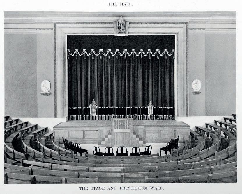 was necessary, but rather than commencing afresh, the plans were whittled down with great skill, so that in the finished building there was, as a critic observed, no trace to be seen of the pruning knife. Newton faced considerable challenges and disappointments as he worked on plans for the smaller building. He also had to manage an extended brief. As well as being a speech hall and a concert hall with rehearsal rooms, the building now had to be suitable for theatrical productions. A second design was replaced by a third, but the backstage arrangements remained awkward. It was hoped that the new building would seat 1,150, and there were discussions about whether the average boy required a 14-inch or 16-inch sitting space. In the end, when packed, the Hall could seat just over 1,000.