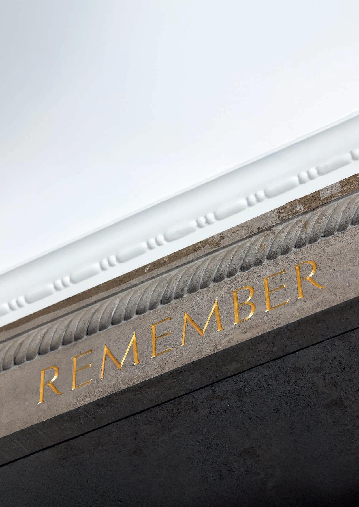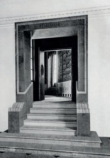 At the opening of the Hall, Norwood commented that words had been used sparingly in the decoration because it was felt that the language of inscriptions was bound to become out of date. Therefore, it had been decided there should be just one word, ‘Remember’, over the lintel of the entrance doors. He praised the simplicity and beauty of the scheme and explained the unified nature of the work with its numerous components: