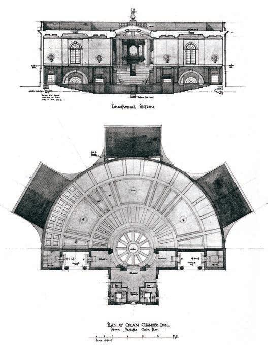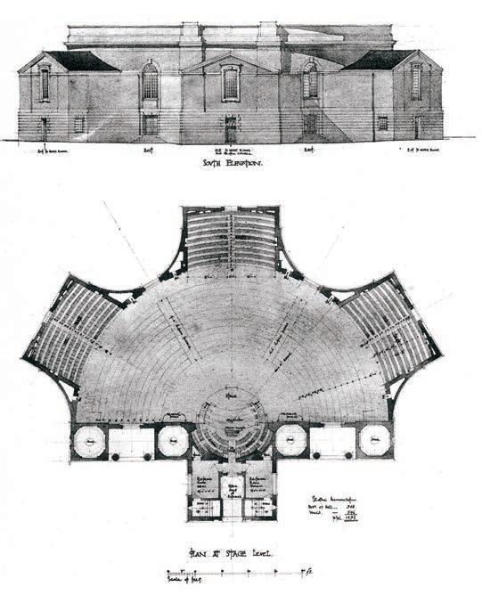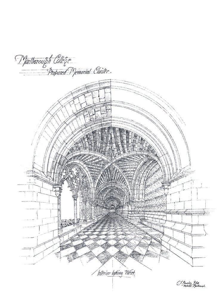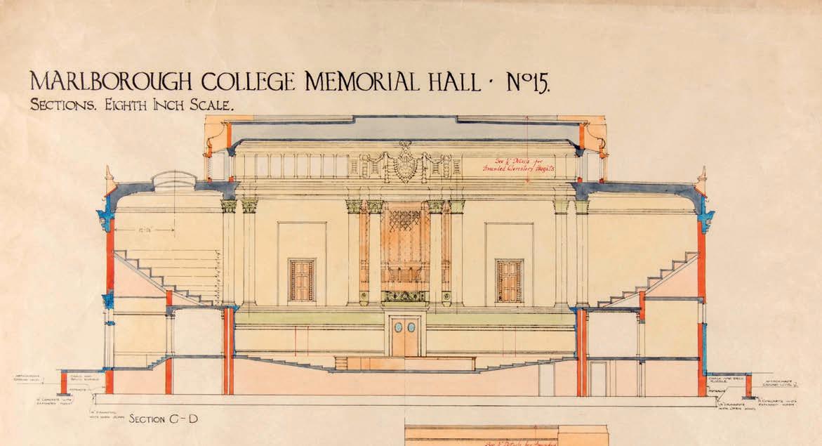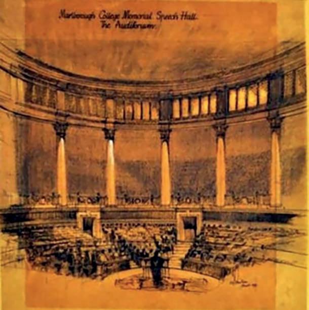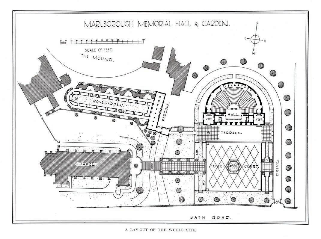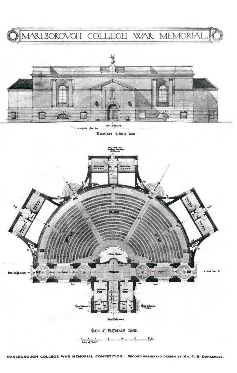 serve no utilitarian purpose at all, but the feeling at Marlborough was that any memorial should help to make the school a better place and there was a need for an assembly hall. There was ‘a strong preference for a Hall in the Amphitheatre style’, and it was felt the architecture should in some way to reflect the design of the C House, the early eighteenthcentury mansion in which the school had started in 1843. The committee also chose the site described as ‘the