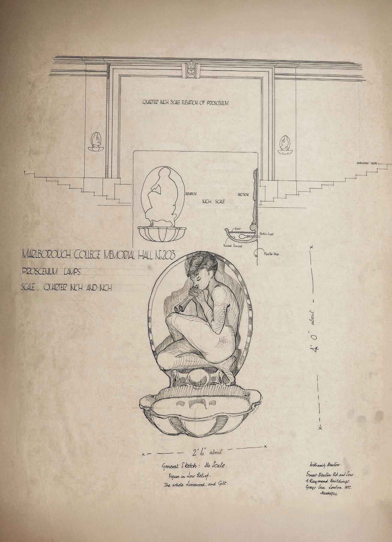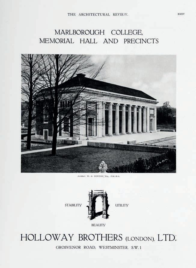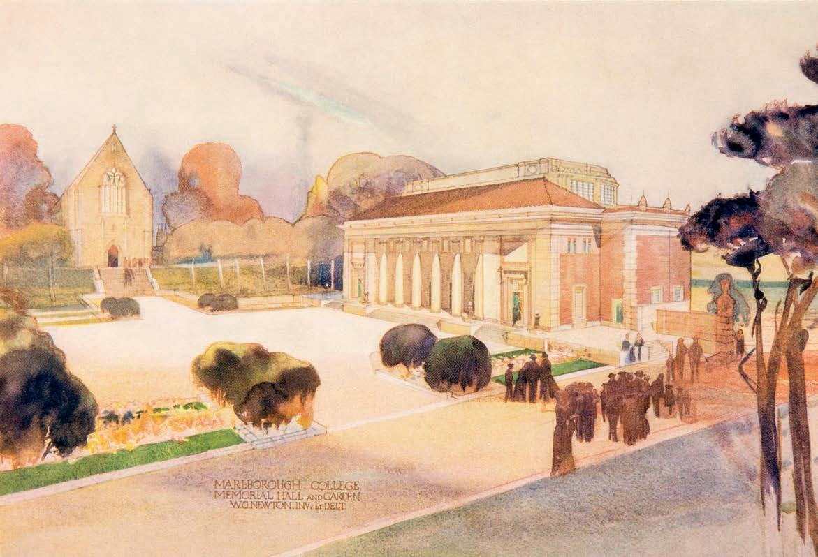 celebrated Arts and Crafts architect Ernest Newton. To begin with, the designs for the Hall were under the name of Ernest’s practice. In many ways William was the ideal architect for Marlborough. He had helped with the memorial building work at Uppingham which his father had commenced in the last years of his life, and he completed the work there after his father died in January 1922. He was an architect who had experienced the war, having served in the Artists Rifles and been awarded the Military Cross. Like his father, he valued teamwork and the importance of careful attention to detail, and he enjoyed a distinguished career producing fine buildings for schools such as Aldenham, Bradfield, Radley and, above all, Merchant Taylors’ School, which moved to a new site at Northwood in 1933. He also became a well-known writer because of his work as editor of The Architectural Review, and he befriended some well-known artists during his professorship at the Royal College of Art, notably Eric Ravilious, who helped with the work at Merchant Taylors’.