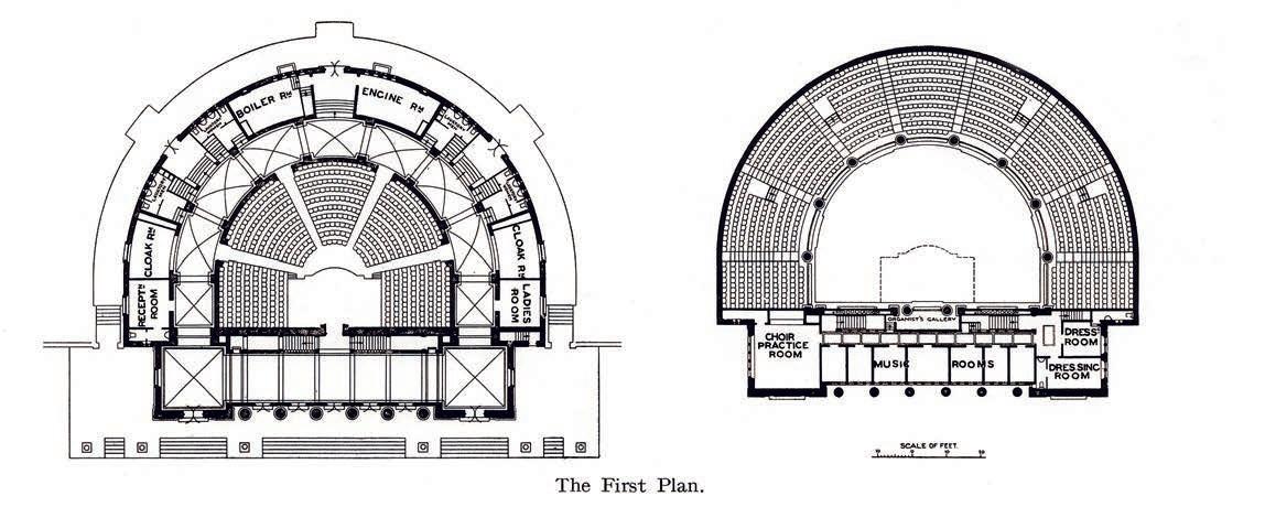 considered in the competition, one had a semicircular frontage towards the road, and another had a low-proportioned dome. The committee had no doubt favoured the amphitheatre form because of its suitability for speeches and assemblies and because of its associations with the Classical world, which was so prominent in the school’s curriculum. There are two interesting examples of this building type in other schools: The Speech Room of 1871 at Harrow, a fine semi-circular hall designed by the great Victorian architect William Burges, which combines Classical theatre with the romantic language of the Gothic revival; and the outdoor theatre at Bradfield known as the ‘Greeker’ – inspired by Frank Benson’s June 1880 Oxford production of the Agamemnon of Aeschylus – which was built in a disused chalk pit in 1890 as the result of an initiative of the headmaster, Herbert Gray.