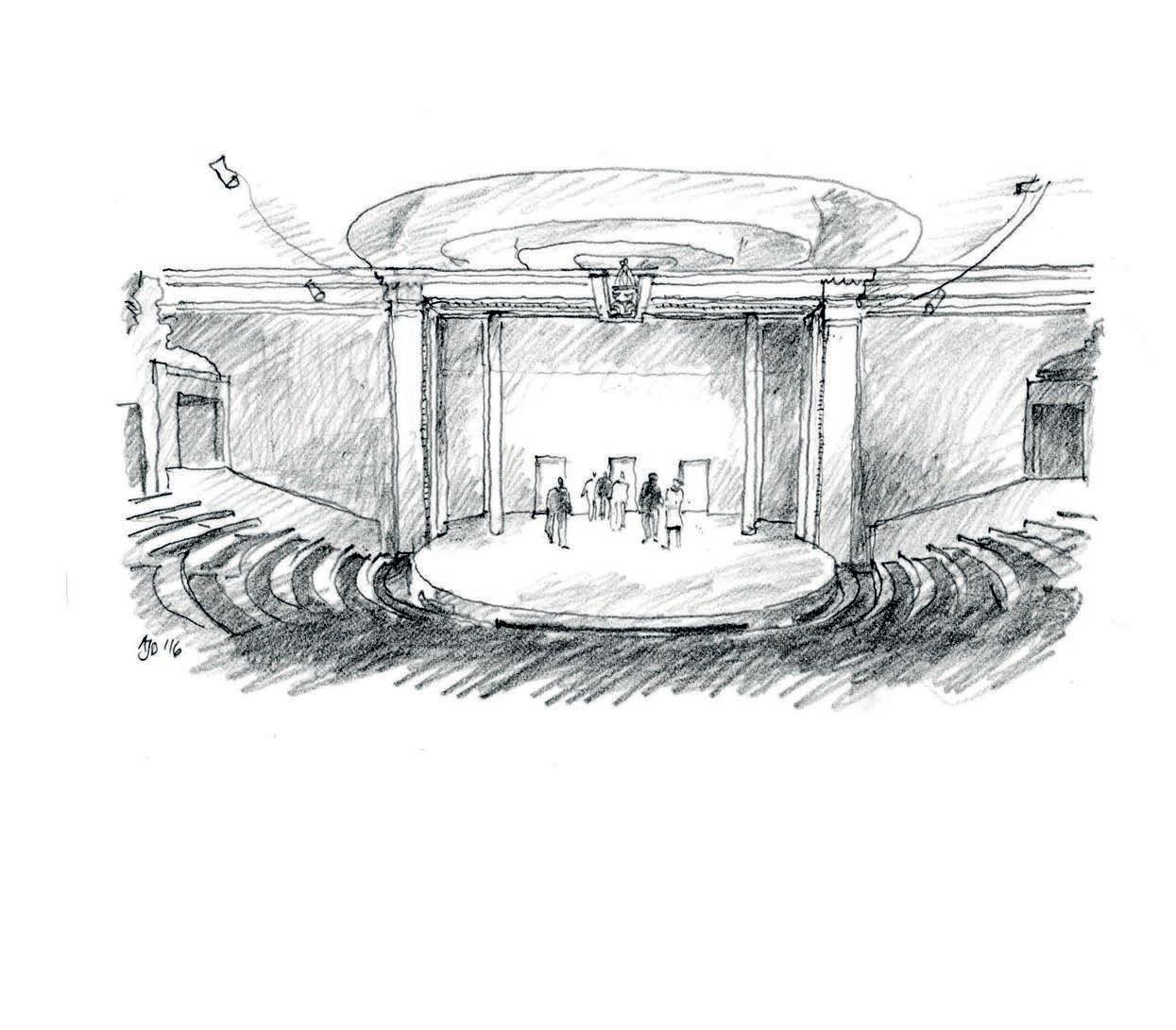 Multifaceted convex panels were added to the back wall to diffuse sound, and acoustic banners put in place to soften loud sound. To compensate for the semicircular room, more volume was required at the point where sound was emitted, but increasing the size of the proscenium arch would be a prohibitively costly structural exercise. The compromise we settled on – which Jack first showed me as a hand drawn sketch on a scrap of paper which is reproduced above – was to retain the two supporting columns on either side of the stage.