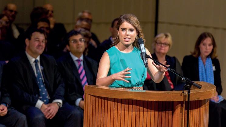 Arriving at 11 a.m., Princess Eugenie was briefed in the Master’s Lodge before embarking on a well-rehearsed plan. Everyone was put at ease through her natural charm and evident love of the College. Setting out to the Art School on what was my last day of twenty-six years of Headship, it was my privilege to lead her along the circuitous route planned. This included time for refreshment with the girls of Mill Mead. Then we walked past the water meadows to the far entrance of the Memorial Hall and thence onto the newly refurbished stage. Common Room lined the back, with invited guests at the front. These included the Lord Lieutenant and our own Lisa Farrell, the then Mayor of Marlborough. The College packed the newly restored benches and awaited two brief speeches.
