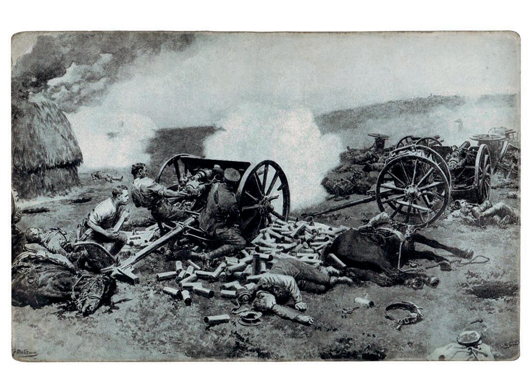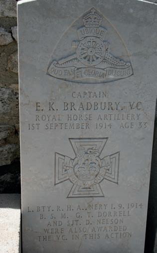 ‘Come on! Who’s for the guns?’ Bradbury led the charge out of cover into the open to bring the guns of L Battery into action. Among the men who joined Bradbury at the guns was Lieutenant Jack Giffard (CO 1898-1901). The Germans had twelve guns bombarding the village, but the fire from Bradbury’s gun (soon the sole surviving one) was so severe and accurate that soon all the German guns were ranged on that one weapon, affording the British cavalry enough respite to organise themselves for defence and counterattack. Bradbury continued firing an estimated 160 rounds before reinforcements arrived, despite losing both his legs. He died from his wounds that same day and is buried in the village cemetery at Nery.