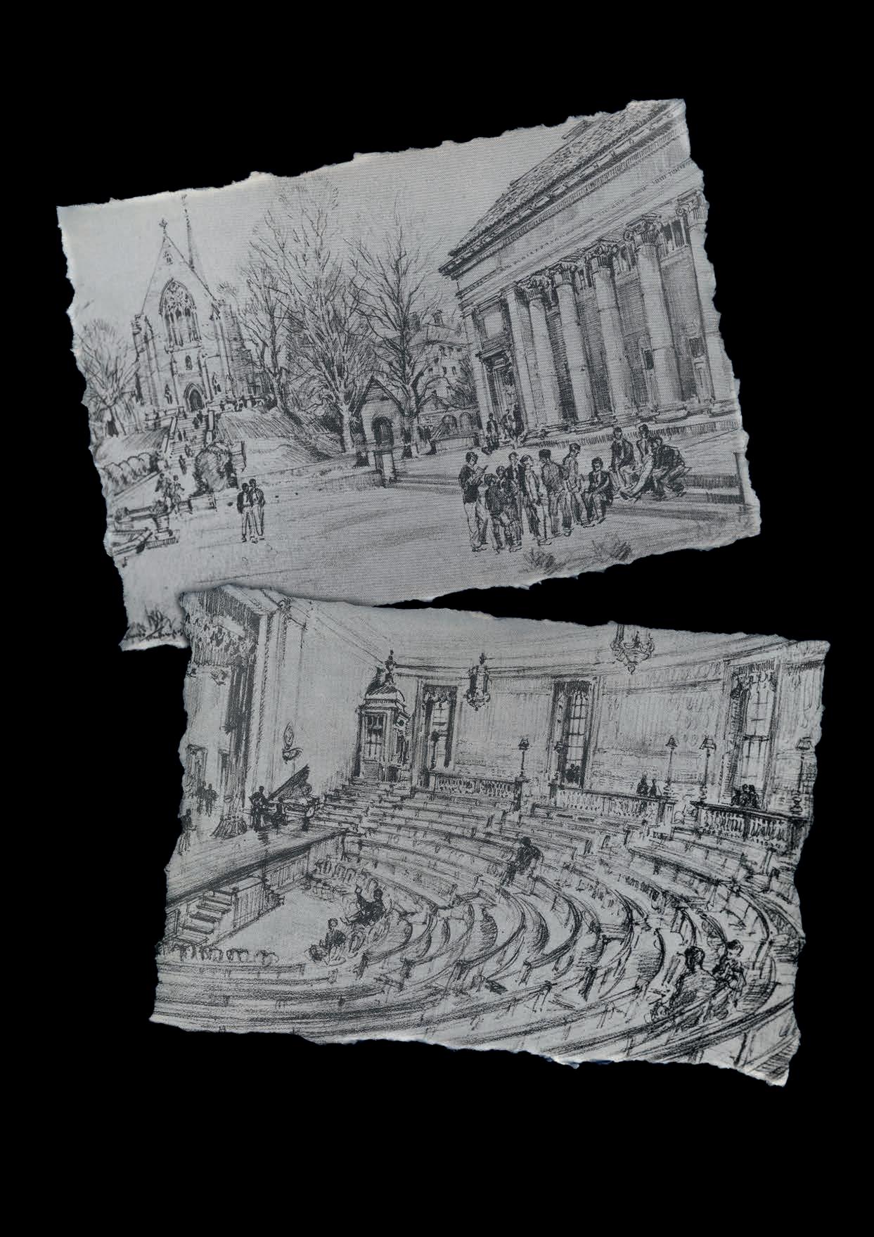 Newton’s first design for the speech hall was very ambitious, with seating for 1,500, a great columned ambulatory, a Baroque-inspired screen above the stage and a band of high clerestory windows above the auditorium. There was no proscenium arch because the building was not intended for theatrical performances. The ambulatory’s projecting walls framed the building’s northern façade with its six great columns, and a parapet which marked the level of the clerestory windows arose above the tiled roof. The Hall’s Classicism and its entrance front, set well back from the Bath Road, were designed to contrast with and complement the Gothic Chapel, which stands on the raised site above the Hall. To tackle the problems presented by the watery site and the construction of the concrete raft that the building required, Newton worked with Oscar Faber, the influential pioneering structural engineer, and his own elder brother, Harold Newton (C1 1896-00), a civil engineer.