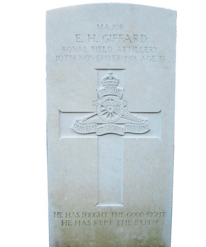 The third to die, tragically only one day before the signing of the Armistice in November 1918, was Eddie (CO 1901-05). He also trained as a field gunner and served as a major in command of a battery for two years almost continuously, until dying of wounds on 10th November 1918. Shortly before his death, Eddie had noted in his diary that he thought the Germans were giving up the fight. One of his friends wrote memorably of his service that it exemplified ‘the spirit of willing endurance’. There is a rather heartening postscript to this Giffard story in that the youngest brother, Walter, who was unable to serve alongside his brothers, having lost the lower part of his left leg in a shooting accident as a boy, became a balloon observer in the Royal Flying Corps so that he could be useful to his brother gunners.