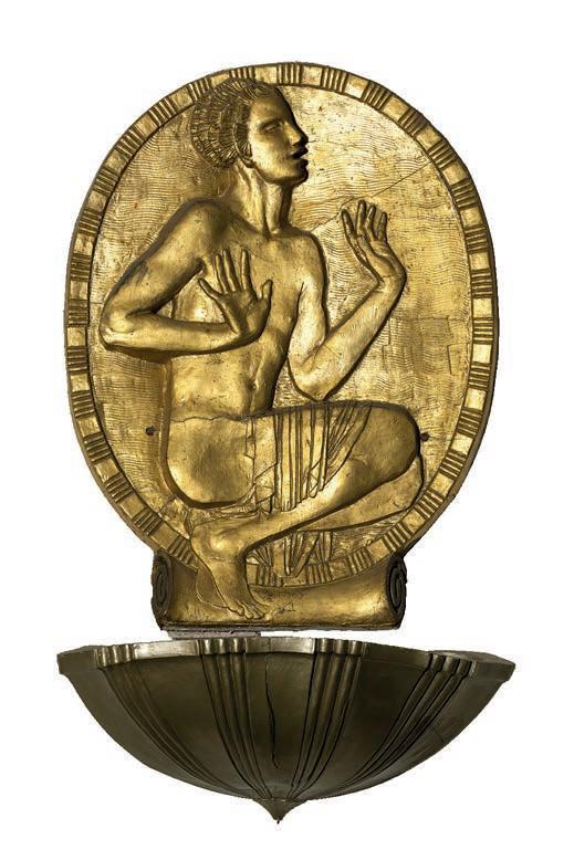 Stabler became well known for her ceramic figures, although she also used metalwork, enamel and wood. Her contributions to the British Empire Exhibition at Wembley in 1924 were particularly well received. These two lights, with their stylised depictions of a faun and a boy, added a theatrical touch to the interior, but they seemed at odds with the architecture and were removed when the Hall was remodelled in 2018, as were the stage curtains and arras wall hangings that used to adorn the walls and windows of the ambulatory. The keystone of the original proscenium arch, made by Esmond Burton (C3 1899-01), took the form of a plaster cherub presenting the arms of the College. This was concealed when the stage area was rearranged.