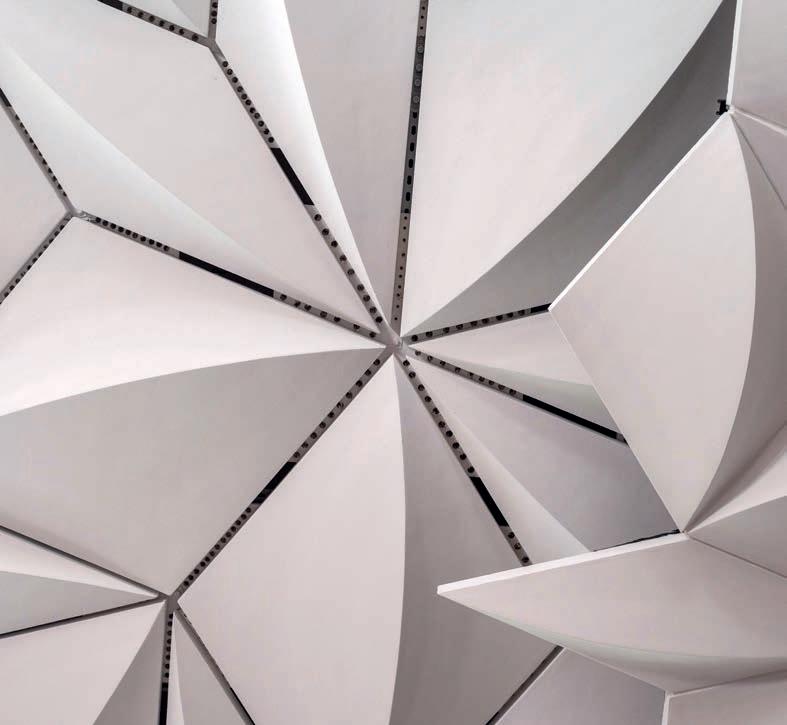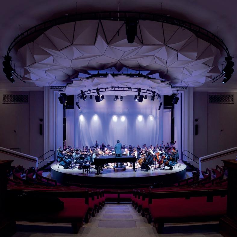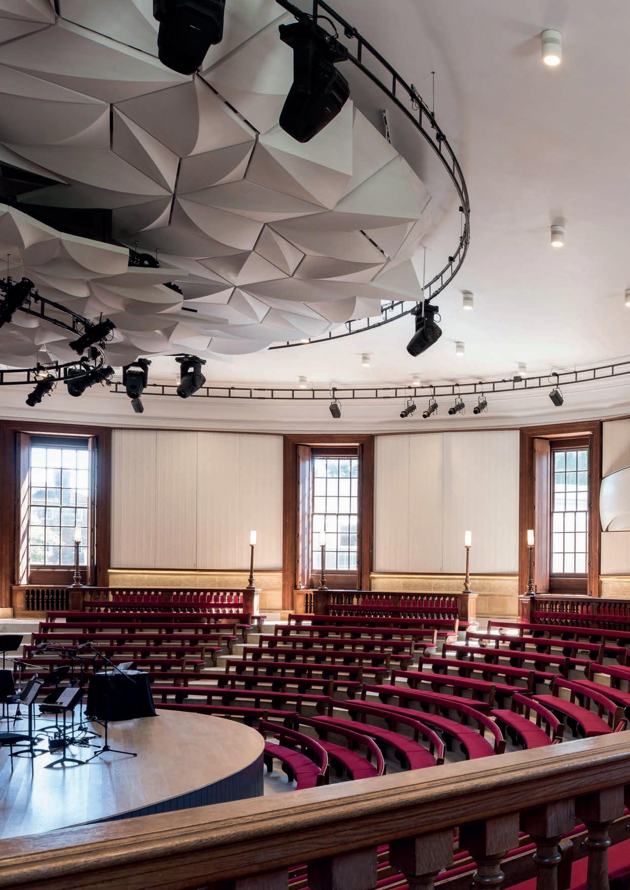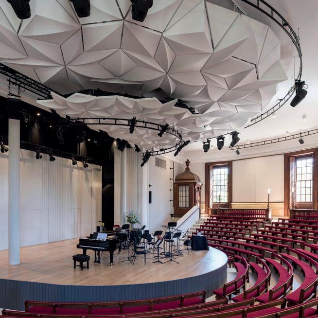 Visually, perhaps the greatest change to the Memorial Hall was the addition of a large sound reflector on the ceiling. Its purpose is fundamental to the acoustics: it diffuses sound across the stage, reducing the echo for performers and improving the quality of sound for the audience. To be most effective, the reflector needed to be multifaceted, which we therefore took into account in the design of its tiling pattern, which is inspired by Penrose tiling. I don’t pretend to understand it, but I can tell you that the pattern of the Memorial Hall reflector does not truly repeat itself and that no two tiles in it are identical.