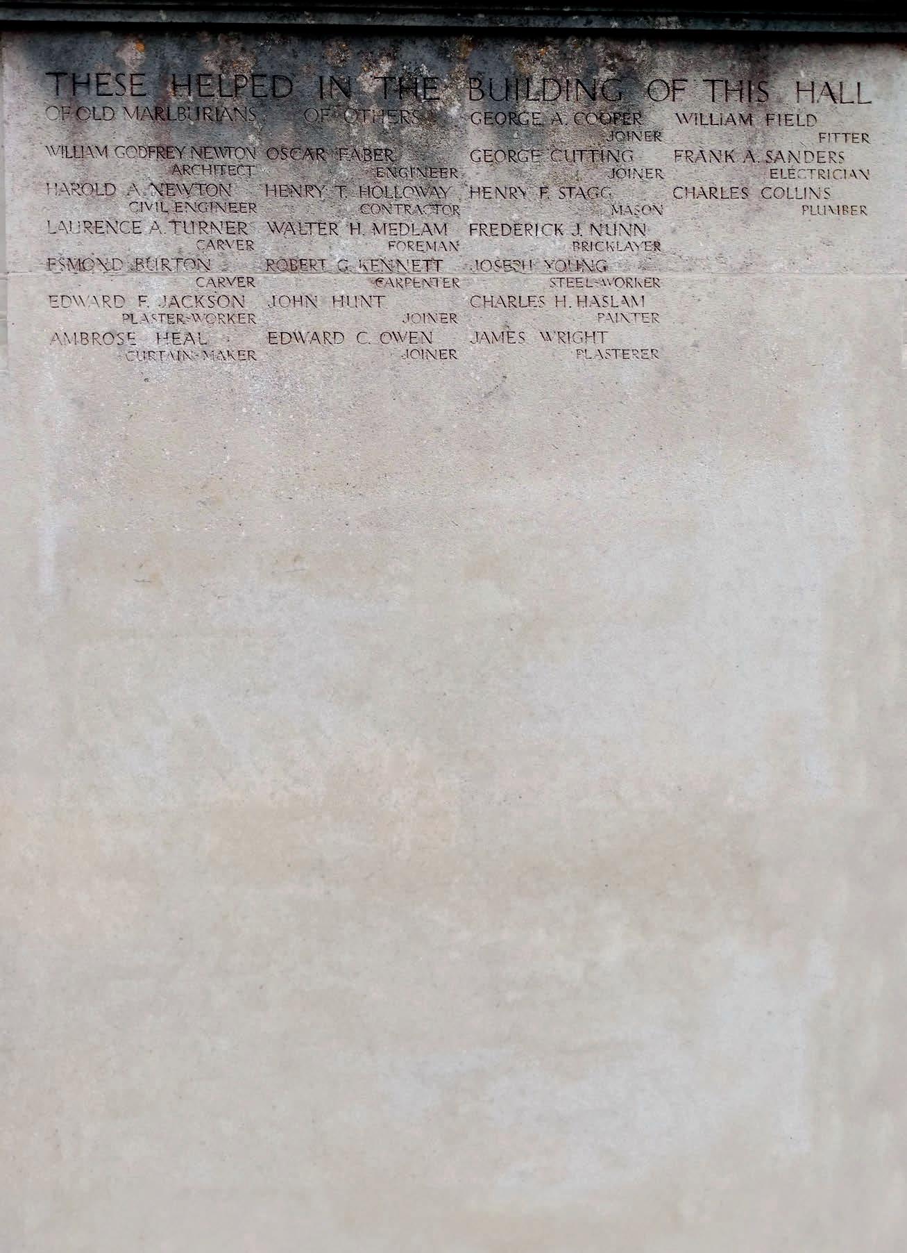 For the Marlborough work, Newton gathered a group of craftsmen and builders, including the Old Marlburians Ambrose Heal (LSch 1885-87), Laurence Turner (C1 1877-81) and Esmond Burton (C3 1899-01). Heal was the distinguished early-twentiethcentury furniture maker whose family founded the eponymous store, and Turner was a celebrated mason and restorer of country houses who became president of the Art Workers’ Guild. Burton, another member of this famous guild, had learned his considerable skills as a stonemason from Turner. On the western wall of the Hall there is a tablet with the inscribed names of those who were involved in executing Newton’s building: all were deemed equal. Heal is described simply as a draper and Turner and Burton as carvers.