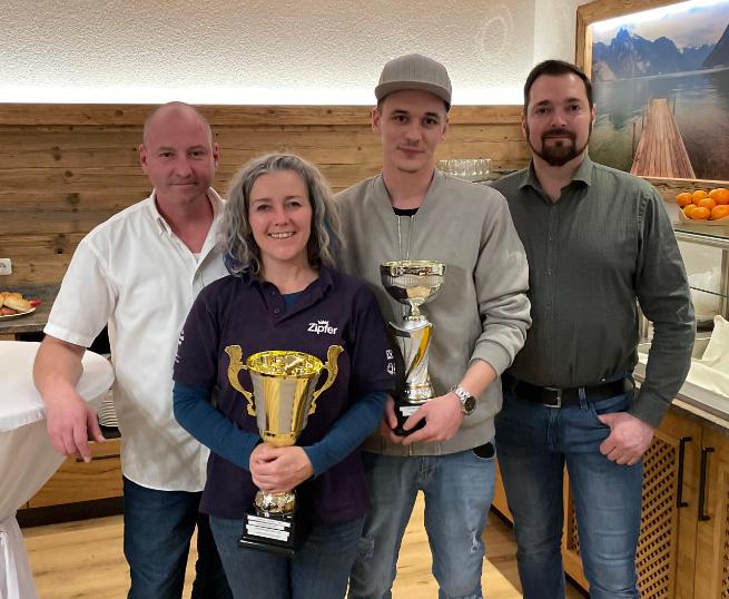 Bereitszum32.MalwurdederOrtsmeisterimSportkegelnermittelt. WirgratulierendenGewinnern. Ortsmeisterin beidenDamen wurdemit20KegelnVorsprung GabiBergthaler. BeidenHerrenwurdederPokalan ReneMatyas übergeben.