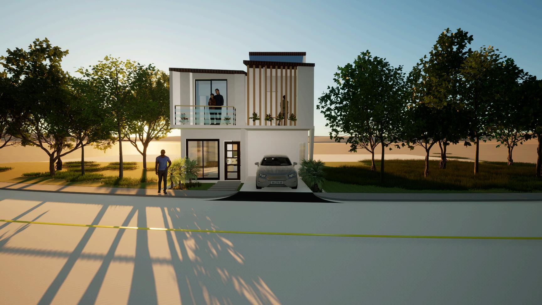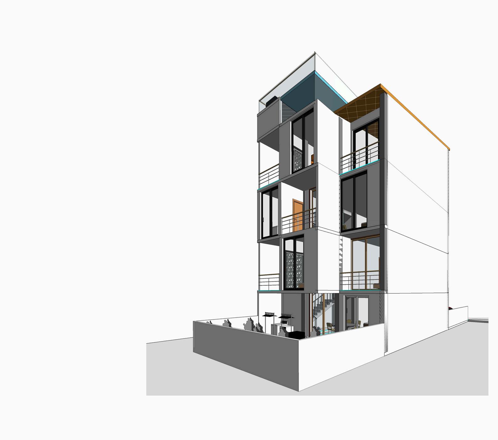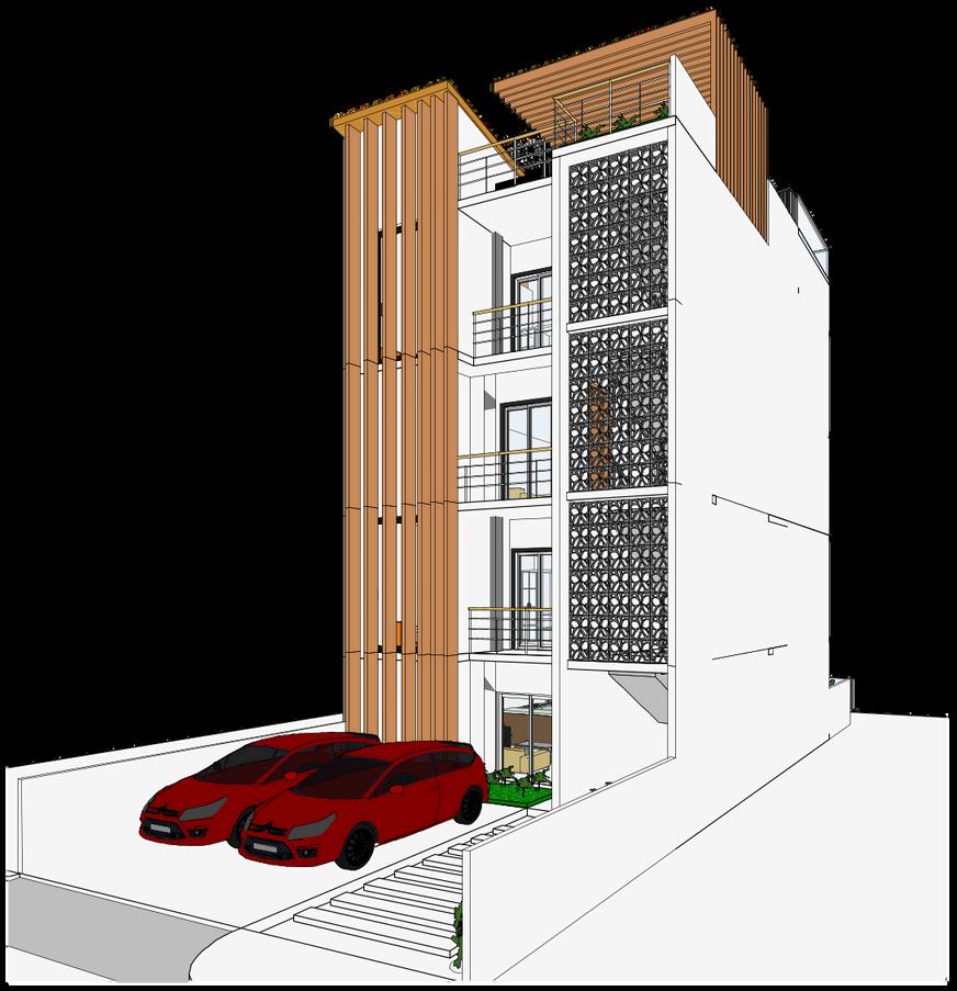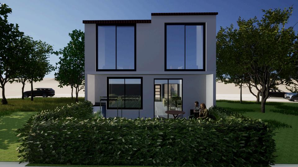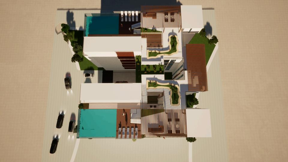 En esta vivienda se ha diseñado la construcción de dos dúplex, cada uno con su propio acceso principal independiente Para garantizar la privacidad de cada familia, se ha incorporado una escalera interior en cada unidad. Además, se ha añadido una piscina en la azotea, como una zona social común.