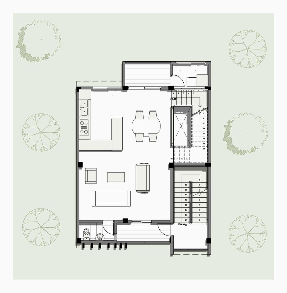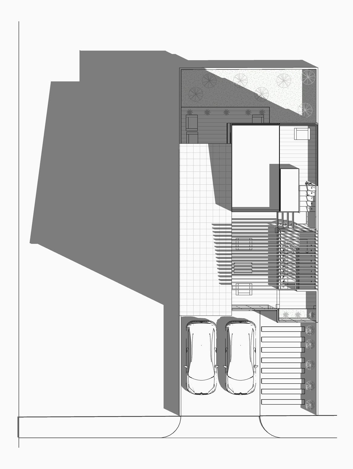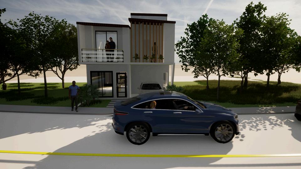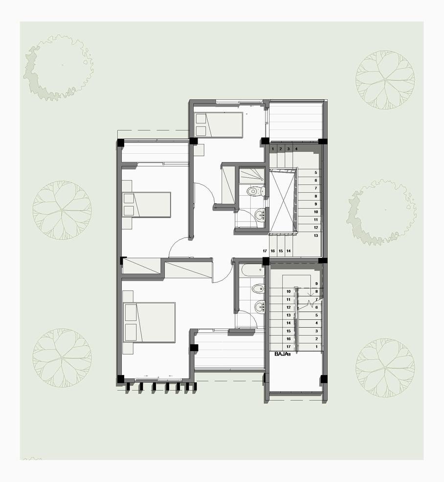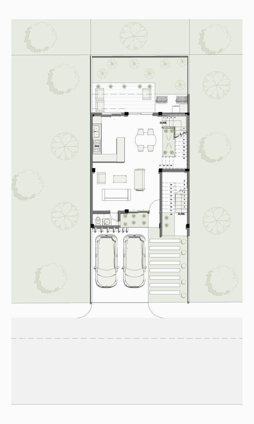 En esta vivienda se ha diseñado la construcción de dos dúplex, cada uno con su propio acceso principal independiente Para garantizar la privacidad de cada familia, se ha incorporado una escalera interior en cada unidad. Además, se ha añadido una piscina en la azotea, como una zona social común.