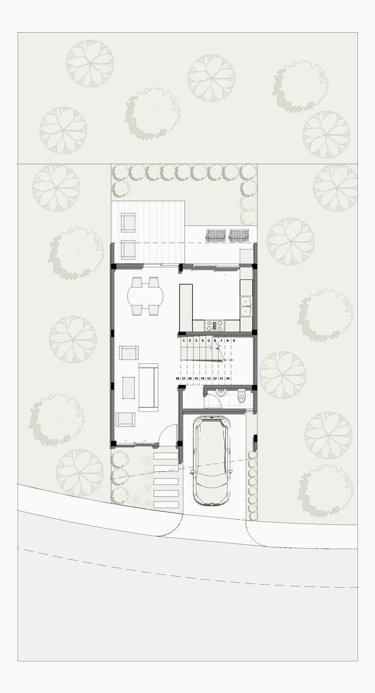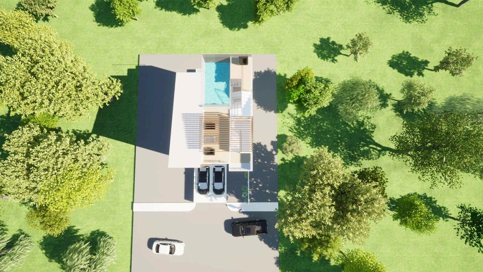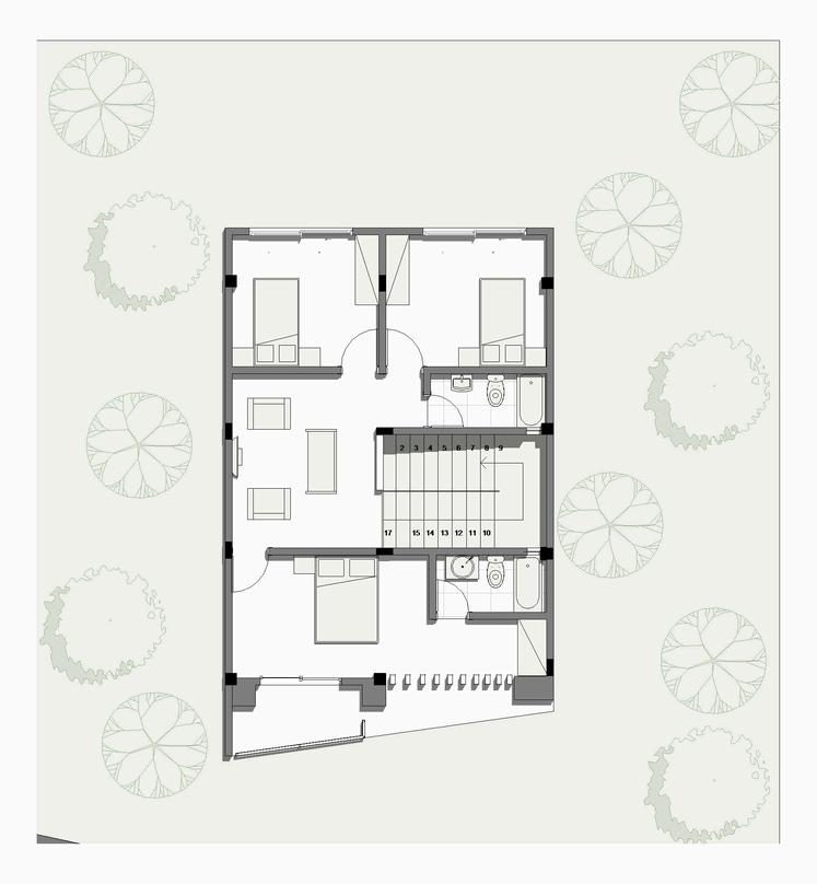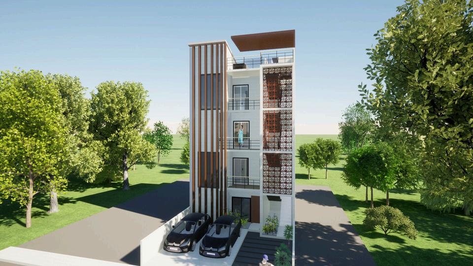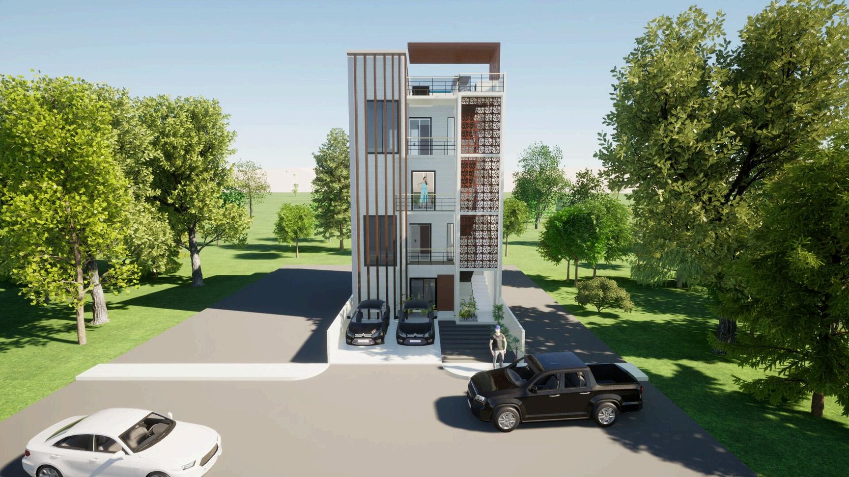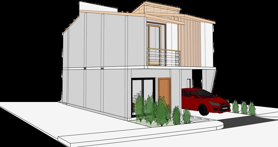 En esta vivienda se ha diseñado la construcción de dos dúplex, cada uno con su propio acceso principal independiente Para garantizar la privacidad de cada familia, se ha incorporado una escalera interior en cada unidad. Además, se ha añadido una piscina en la azotea, como una zona social común.