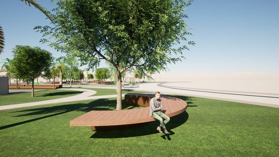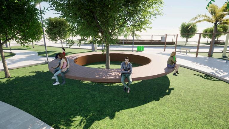 Las bancas dispuestas alrededor de un árbol, proporcionan áreas sombreadas y cómodas para que los residentes puedan relajarse y disfrutar del entorno natural